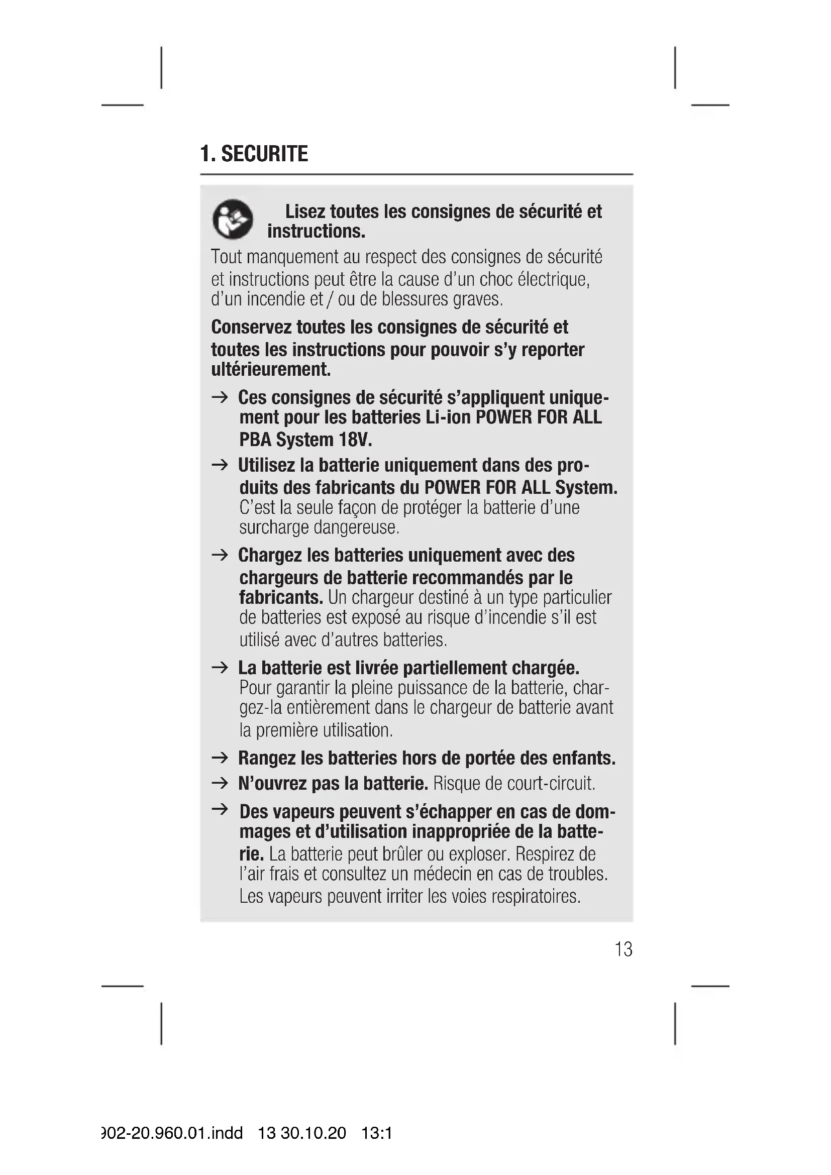 14902-20.960.01.indd 12 30.10.20 13:191. SECURITE Lisez toutes les consignes de sécurité et instructions. Tout manquement au respect des consignes de sécurité et instructions peut être la cause d’un choc électrique, d’un incendie et / ou de blessures graves. Conservez toutes les consignes de sécurité et toutes les instructions pour pouvoir s’y reporter ultérieurement. v Ces consignes de sécurité s’appliquent unique- ment pour les batteries Li-ion POWER FOR ALL PBA System 18V. v Utilisez la batterie uniquement dans des pro- duits des fabricants du POWER FOR ALL System. C’est la seule façon de protéger la batterie d’une surcharge dangereuse. v Chargez les batteries uniquement avec des chargeurs de batterie recommandés par le fabricants. Un chargeur destiné à un type particulier de batteries est exposé au risque d’incendie s’il est utilisé avec d’autres batteries. v La batterie est livrée partiellement chargée. Pour garantir la pleine puissance de la batterie, char- gez-la entièrement dans le chargeur de batterie avant la première utilisation. v Rangez les batteries hors de portée des enfants. v N’ouvrez pas la batterie. Risque de court-circuit.