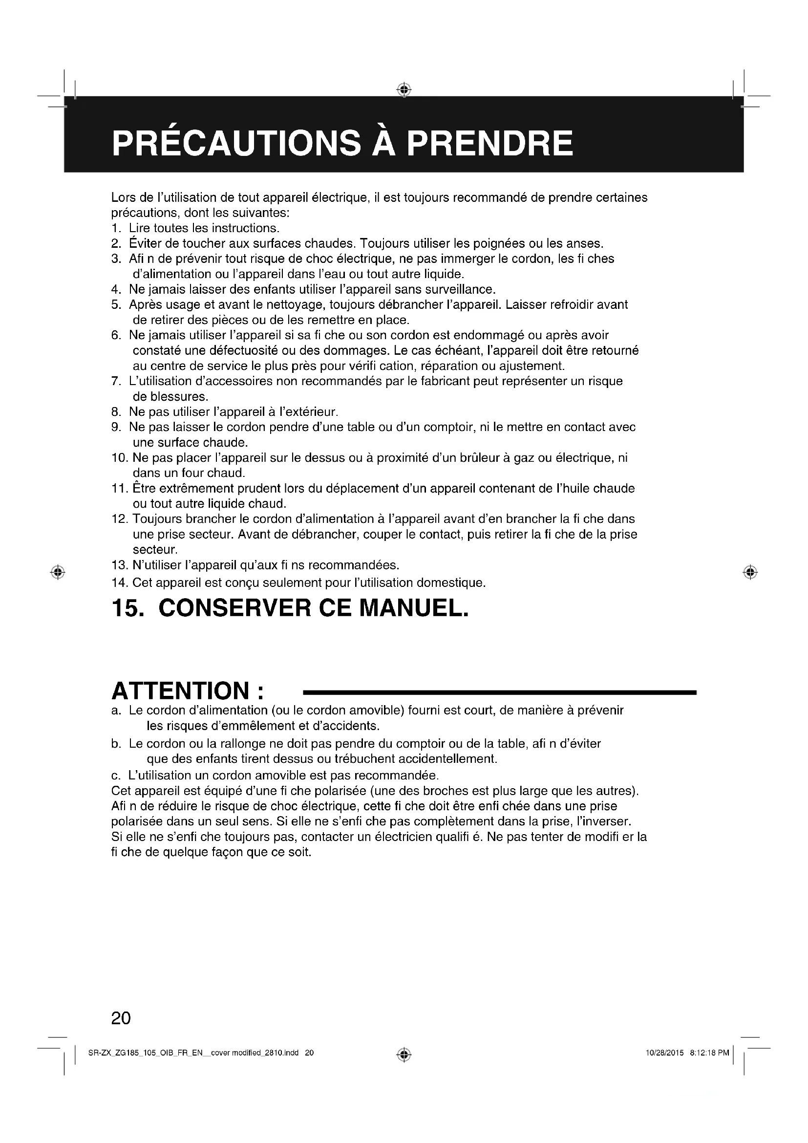 - N’exposez pas la fi che d’alimentation à la vapeur lorsqu’elle est branchée. (Risque d’incendie provoqué par un court-circuit). Si vous utilisez un meuble avec un plateau coulissant, utilisez l’appareil à un endroit où la fi che d’alimentation ne peut pas être exposée à la vapeur. Veuillez à maintenir la fiche côté appareilou la fiche d’alimentation pour ladébrancher. Ne tirez pas sur le cordond’alimentation.(Risque de choc électrique ou d’incendieprovoqué par un court-circuit) Débranchez la fi ched’alimentation de la prised’alimentation lorsque l’appareilest inutilisé.(Risque de choc électrique et d’incendieprovoqué par un court-circuit à caused’une détérioration de l’isolant). Ne touchez pas leséléments chauffantslorsque l’appareil esten cours d’utilisationou après la cuisson.En particulier laplaque chauffante.(Risque de brûlure). N’utilisez pas de cordon d’alimentation(pour la fi che côté appareil et la fi ched’alimentation) non spécifi é pour uneutilisation avec cet appareil. Ne lestransférez pas non plus.(Risque de choc électrique, defuite et d’incendie). L’élément chauffant gardeune chaleur résiduelle aprèsutilisation. Laissez l’appareilrefroidir avant de le nettoyer.(Toucher les éléments chaudspeut occasionner une brûlure). Ne touchez pas lebouton du loquet touten déplaçant l’appareil.(Risque d’ouverturedu couvercle extérieurpouvant occasionnerune brûlure). Soyez prudent avec la surface chaude inoxydable jante en acier du boîtier supérieur.(SR-ZX185 / SR-ZX105)(Risque de brûlure). (Risque de brûlure ou de blessure à cause d’unesurchauffe ou d’undysfonctionnement). Précautions d’utilisation Veuillez mettre la bonne quantitéd’eau et de riz et sélectionnerles fonctions correctement etconformément aux instructionsd’utilisation.(Pour éviter un débordement de l’eaudu riz, le riz à moitié cuit ou le riz brûlé).Avant d’utiliser l’appareil, lepapier anti-ternissure placé entrele panier de cuisson et la plaquechauffante doit être retiré.(Pour éviter une mauvaise cuissonou un incendie).Nettoyez toujours les corps étrangers tels quele riz resté dans le panier de cuisson, la plaquechauffante et le capteur de température.• Ne basculez pas ou neretournez pas l’appareil.• Avant le nettoyage,mettez l’appareilhors marche avec lebouton d’alimentationet débranchez la fi ched’alimentation.Ne mettez pas d’ingrédients àcuire directement dans l’appareilsi aucun panier de cuisson nes’y trouve. Ne cuisinez pas sanspanier de cuisson.(Pour empêcher toute impureté deprovoquer une panne).Ne couvrez pas le couvercle extérieuravec un linge ou d’autres objets lorsquel’appareil est en cours d’utilisation.(Pour éviter la déformation,le changement de couleur ducouvercle extérieur ou une panne).Évitez d’utiliser l’appareil sous lalumière directe du soleil.(Pour éviter tout changement de couleur).Ne servez pas le riz avec unobjet en métal.(Pour éviter de rayer lerevêtement du panier de cuissonet de provoquer l’écaillage durevêtement).En cas de débordement d’eaudu riz par l’évent à vapeur,retirez la fi che d’alimentationimmédiatement pour couperl’alimentation électrique.Ne reprenez pas l’utilisationavant que l’eau du riz sur lafi che d’alimentation et la fi checôté appareil ne soit retiréeavec un chiffon sec.L’appareil est réservé à un usagedomestique. Ne l’utilisez pas à dequelconques fi ns commercialesou industrielles ou à des fi nsautres que la cuisson.Si une panne d’alimentationsurvient pendant le fonctionnementde l’appareil, le résultat de lacuisson peut être affecté.CorpsétrangersPlaquechauffanteCapteurde températurePanier de cuissonT N’utilisez pas d’autres paniers de cuisson que celui qui est spécifi é.Ne laissez pas le déversement de l’eau sur la prise d’alimentation de l’ensemble du cordon d’alimentation.Utilisez uniquement une éponge. Précautions de sécurité À respecter obligatoirement ! SR-ZX_ZG185_105_OIB_FR_EN__cover modified_2810.indd 22SR-ZX_ZG185_105_OIB_FR_EN__cover modified_2810.indd 22 10/28/2015 8:12:38 PM10/28/2015 8:12:38 PM7