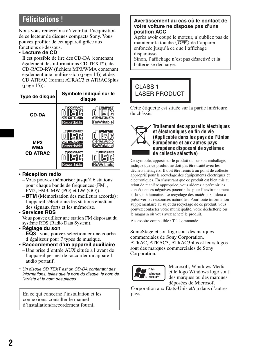 également des informations CD TEXT*), des CD-R/CD-RW (fichiers MP3/WMA contenant également une multisession (page 14)) et des CD ATRAC (format ATRAC3 et ATRAC3plus (page 15)). Type de disque