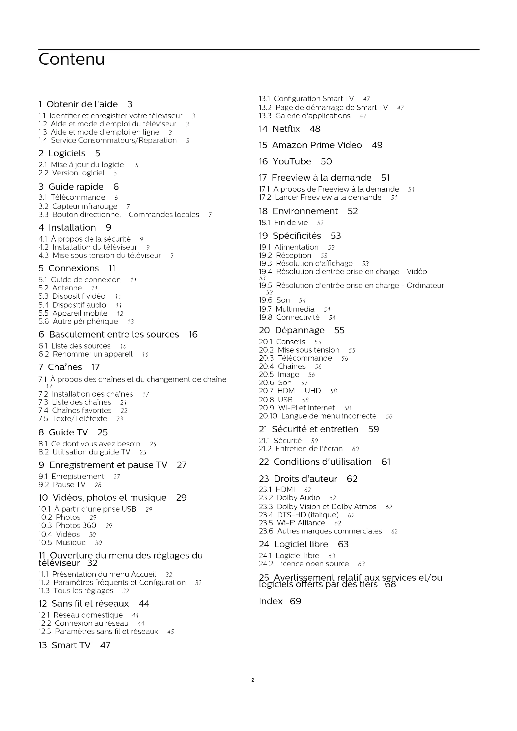 Avertissement relatif aux services et/ou logiciels offerts par des tiers Les services et/ou logiciels offerts par des tiers peuvent être modifiés, suspendus ou supprimés sans préavis. TP Vision n'assume aucune responsabilité dans ces situations. 68Index