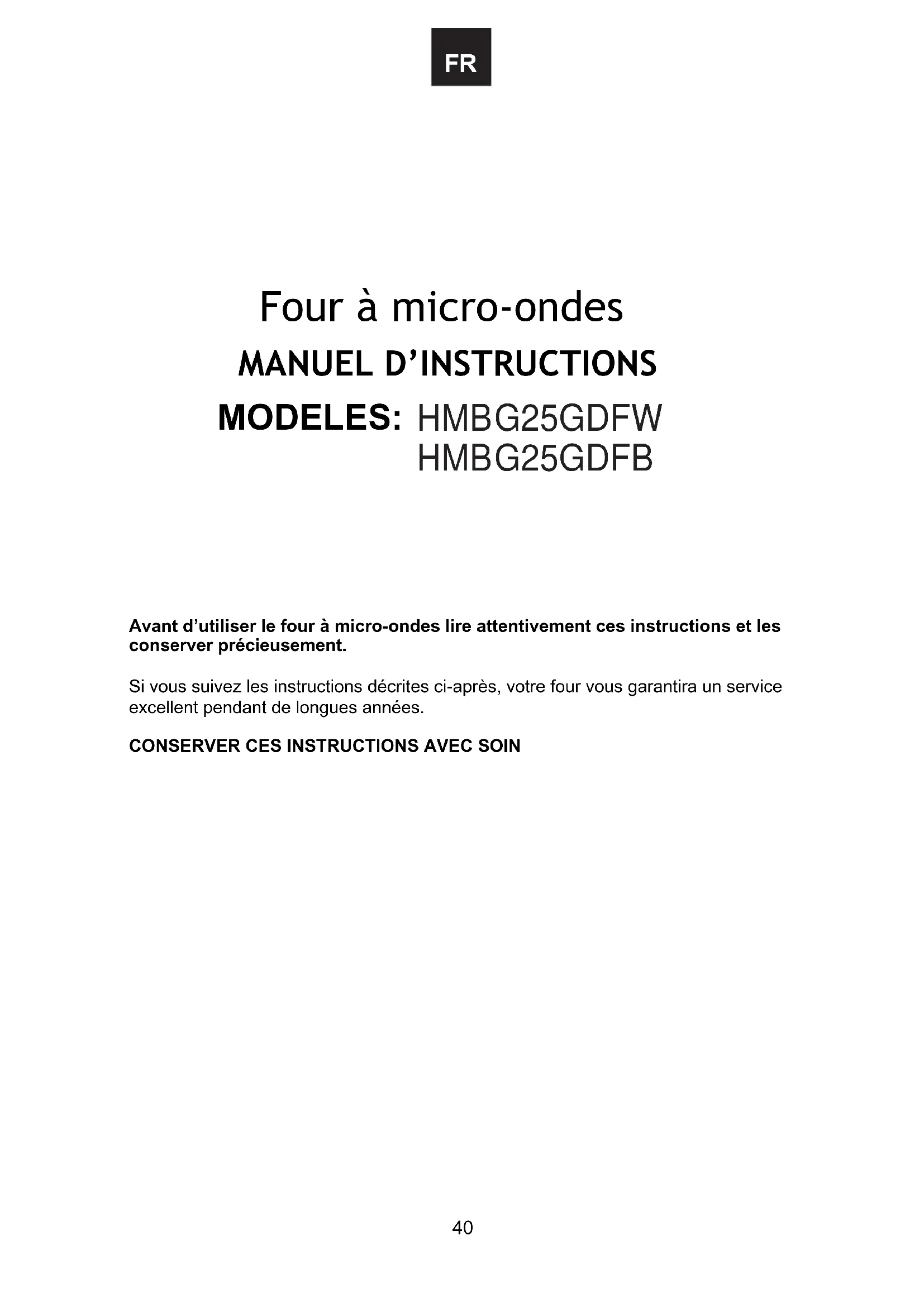 MODELES: Avant d’utiliser le four à micro-ondes lire attentivement ces instructions et les conserver précieusement. Si vous suivez les instructions décrites ci-après, votre four vous garantira un service excellent pendant de longues années.CONSERVER CES INSTRUCTIONS AVEC SOIN