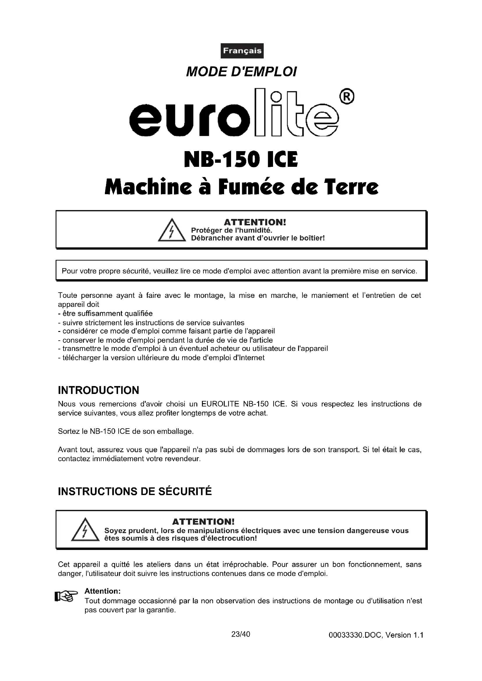 NB150 ICE - Machine à effet Eurolite - Notice d'utilisation et mode d'emploi gratuit