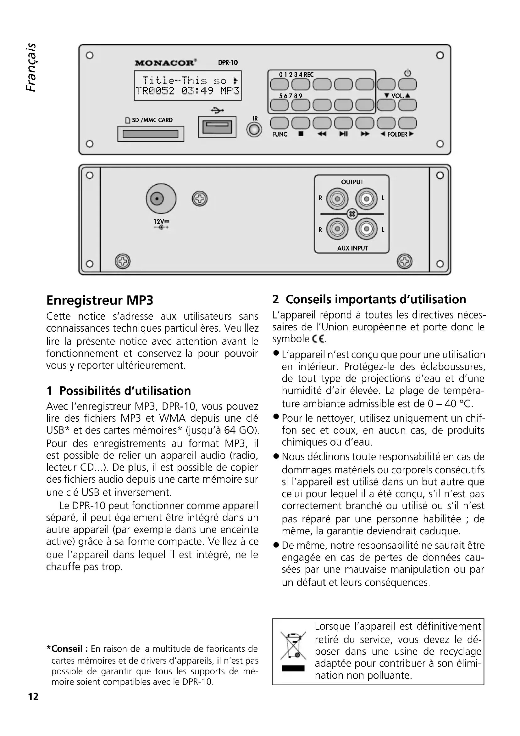 DPR-10 12V OUTPUTAUX INPUT R L R L Enregistreur MP3 Cette notice s’adresse aux utilisateurs sans connaissances techniques particulières. Veuillez lire la présente notice avec attention avant le fonctionnement et conservez-la pour pouvoir vous y reporter ultérieurement. 1 Possibilités d’utilisation Avec l’enregistreur MP3, DPR-10, vous pouvez lire des fichiers MP3 et WMA depuis une clé USB* et des cartes mémoires* (jusqu’à 64 GO). Pour des enregistrements au format MP3, il est possible de relier un appareil audio (radio, lecteur CD...). De plus, il est possible de copier des fichiers audio depuis une carte mémoire sur une clé USB et inversement. Le DPR-10 peut fonctionner comme appareil séparé, il peut également être intégré dans un autre appareil (par exemple dans une enceinte active) grâce à sa forme compacte. Veillez à ce que l’appareil dans lequel il est intégré, ne le chauffe pas trop.