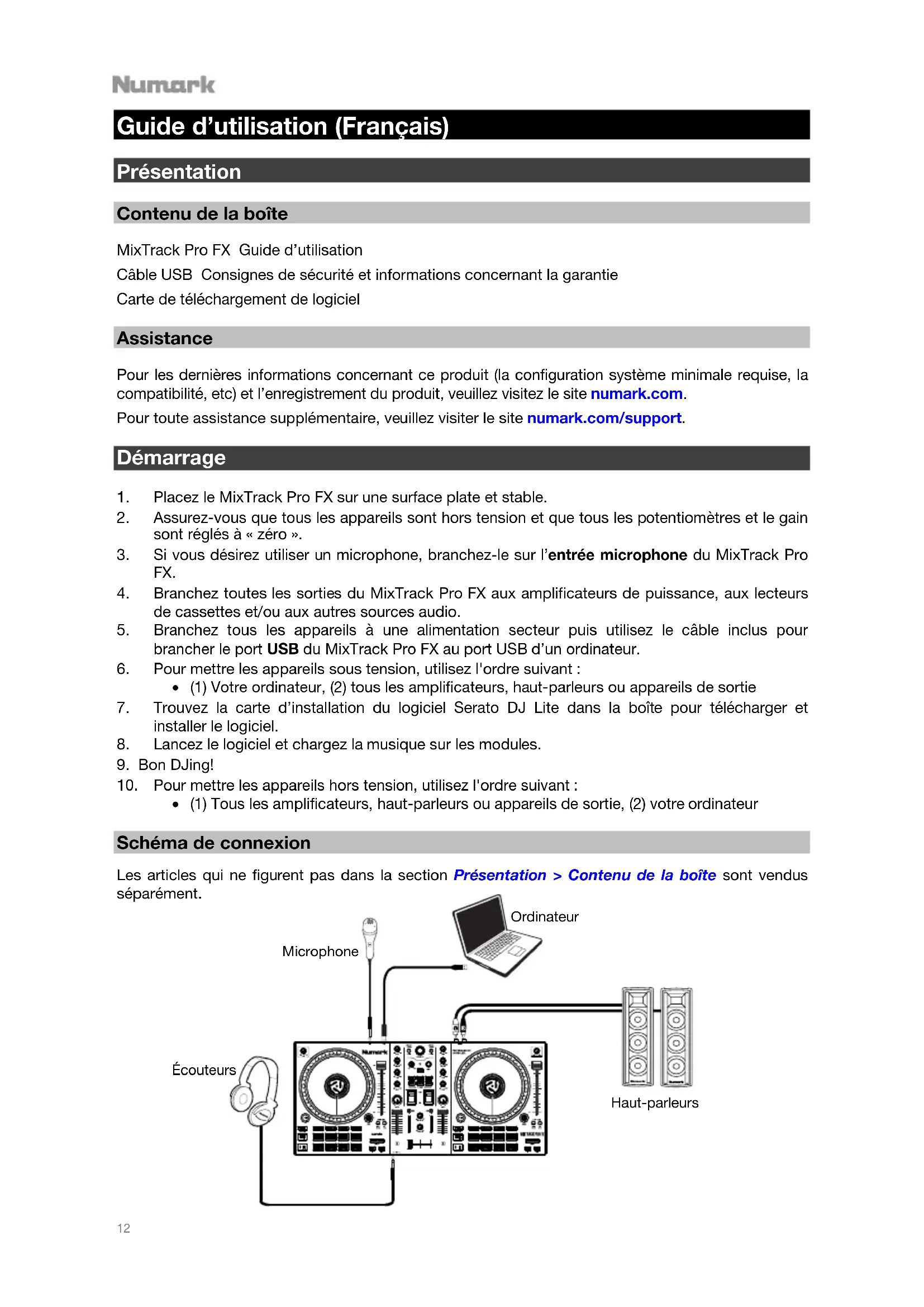 Guide d’utilisation (Français) Présentation Contenu de la boîte MixTrack Pro FX Guide d’utilisation Câble USB Consignes de sécurité et informations concernant la garantie Carte de téléchargement de logiciel Assistance Pour les dernières informations concernant ce produit (la configuration système minimale requise, la compatibilité, etc) et l’enregistrement du produit, veuillez visitez le site numark.com. Pour toute assistance supplémentaire, veuillez visiter le site numark.com/support. Démarrage