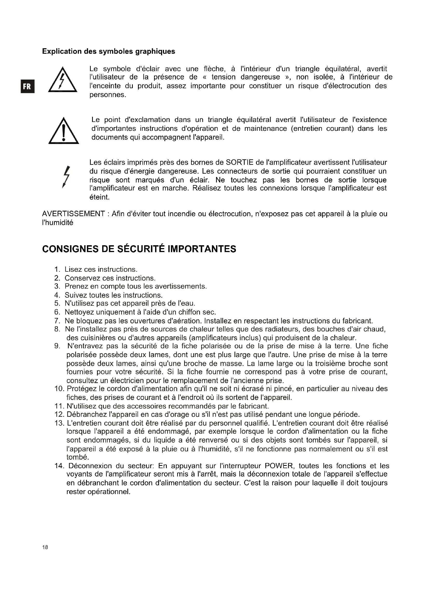 Les éclairs imprimés près des bornes de SORTIE de l'amplificateur avertissent l'utilisateur du risque d'énergie dangereuse. Les connecteurs de sortie qui pourraient constituer un risque sont marqués d'un éclair. Ne touchez pas les bornes de sortie lorsque l'amplificateur est en marche. Réalisez toutes les connexions lorsque l'amplificateur est éteint.