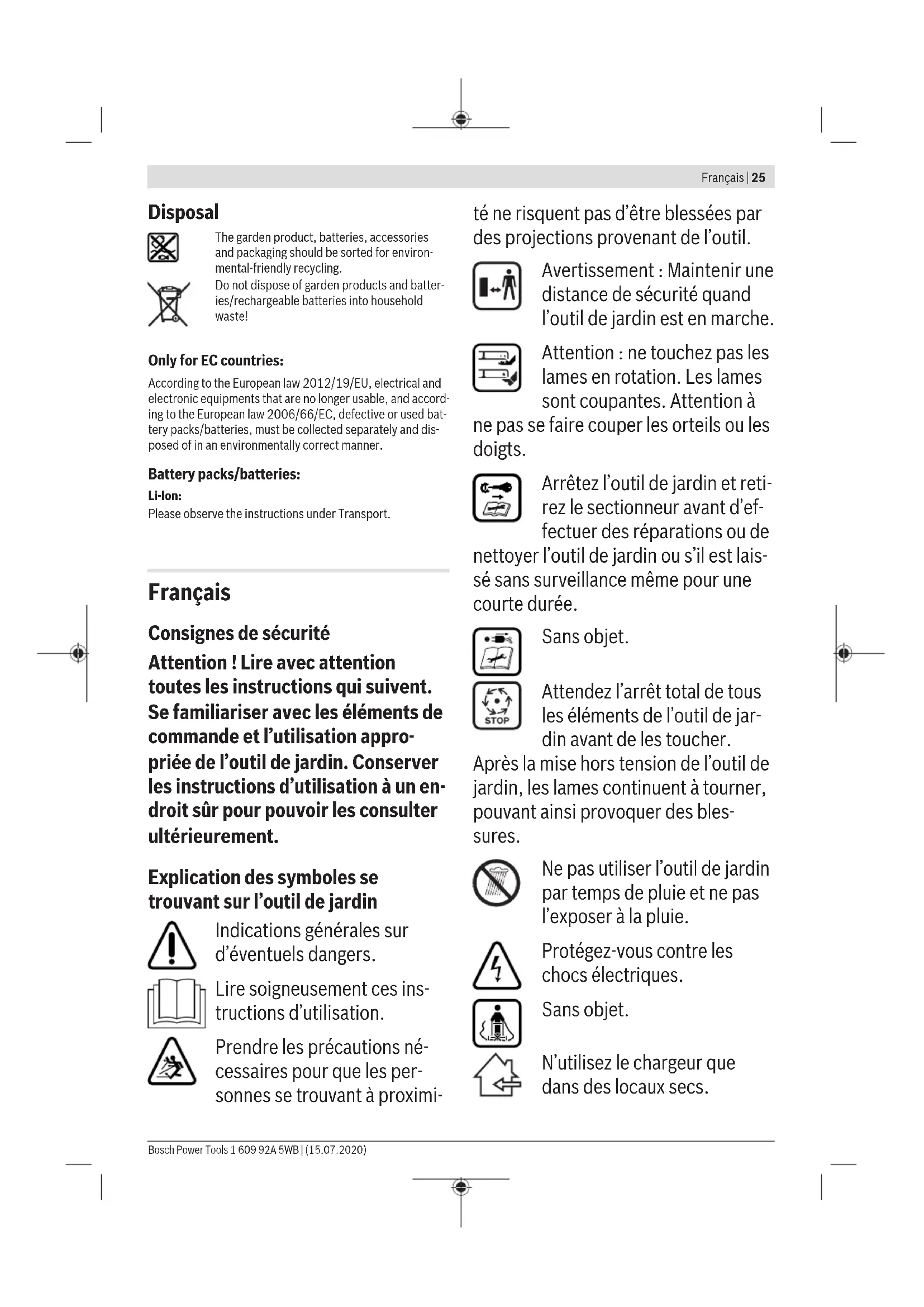 distance de sécurité quand l’outil de jardin est en marche. Attention: ne touchez pas les lames en rotation. Les lames sont coupantes. Attention à ne pas se faire couper les orteils ou les doigts. Arrêtez l’outil de jardin et reti- rez le sectionneur avant d’ef- fectuer des réparations ou de nettoyer l’outil de jardin ou s’il est lais- sé sans surveillance même pour une courte durée. Sans objet. Attendez l’arrêt total de tous les éléments de l’outil de jar- din avant de les toucher. Après la mise hors tension de l’outil de jardin, les lames continuent à tourner, pouvant ainsi provoquer des bles- sures. Ne pas utiliser l’outil de jardin par temps de pluie et ne pas l’exposer à la pluie. Protégez-vous contre les chocs électriques. Sans objet. N’utilisez le chargeur que dans des locaux secs. Bosch Power Tools 1 609 92A 5WB | (15.07.2020)26 | Français Le chargeur dispose d’un transformateur de sécurité. N’utilisez pas de nettoyeur haute pression ni de tuyau d’arrosage pour nettoyer l’outil de jar- din. Assurez-vous qu’il n’y ait pas d’animaux sauvages ou do- mestiques dans la zone dans laquelle l’outil de jardin doit être utili- sé. Les animaux sauvages ou domes- tiques peuvent être blessés pendant l’utilisation de la machine. Contrôlez soigneusement la zone d’utilisation de la machine et retirez pierres, bâtons, fils, os et corps étrangers. Lors de l’uti- lisation de la machine, assurez-vous qu’aucun animal sauvage ou domes- tique, ni des petits troncs d’arbre ne soient cachés dans l’herbe épaisse. Utilisation u Ne laissez jamais un enfant ou une autre personne n’ayant pas pris connaissance des instructions d’utili- sation se servir du produit. Il est pos- sible que les réglementations natio- nales limitent l’âge minimum de l’opérateur. Gardez le produit non utilisé hors de la portée des enfants. u Ne permettez jamais aux enfants ou personnes ne disposant pas des ca- pacités physiques, sensorielles ou mentales adaptées ou n’ayant pas l’expérience et/ou les connaissances nécessaires d’utiliser ce produit. Il est possible que les réglementations nationales limitent l’âge minimum de l’opérateur. u Les enfants doivent être surveillés pour s’assurer qu’ils ne jouent pas avec le produit. u N’utilisez jamais l’outil de jardin lorsque des personnes, en particu- lier des enfants ou des animaux do- mestiques, se trouvent à proximité. u L’utilisateur de la tondeuse est res- ponsable des accidents et des dom- mages causés à autrui ou à leurs biens. u Ne portez pas de chaussures en ca- outchouc ouverts ou des sandalettes quand vous utilisez le produit. Portez toujours des chaussures fermées et des pantalons longs. Ne faites jamais fonctionner le produit si vous êtes pieds nus. u Inspectez soigneusement la surface à travailler et éliminez pierres, bâ- tons, fils métalliques, os et autres corps étrangers. u Avant de mettre l’appareil en marche, contrôlez toujours si les lames, les vis des lames et le sous- groupe de coupage ne sont pas usés ou endommagés. Remplacez les lames usées ou endommagées tou- jours en même temps que les vis des lames pour éviter tout balourd. u Ne tondez que de jour ou sous un bon éclairage artificiel. u Ne travaillez pas avec la tondeuse à gazon dans des conditions météoro- logiques défavorables et plus parti- 1 609 92A 5WB | (15.07.2020) Bosch Power ToolsFrançais | 27 culièrement en cas d’approche d’orage. u Si possible, n’utilisez pas l’outil de jardin lorsque l’herbe est mouillée. u Ne menez l’appareil qu’au pas, ne ja- mais courir. u N’utilisez jamais l’outil de jardin quand les équipements de sécurité sont défectueux, sans carter ou sans équipements de protection tels que par exemple le pare-chocs et/ou le bac de ramassage. u Pour votre propre protection, nous vous recommandons de porter une protection acoustique. u N’utilisez pas le produit si vous êtes fatigué ou sous l’emprise de drogues, d’alcool ou de médica- ments. u Travailler sur des talus peut être dan- gereux: – Ne tondez pas des pentes très abruptes. – Sur des pentes ou de l’herbe mouillée, faites attention à ne pas perdre l’équilibre. – Tondez toujours perpendiculaire- ment à la pente, jamais de haut en bas ou de bas en haut. – Faites très attention lors d’un changement de direction sur une pente. u Faites très attention en reculant ou en tirant l’outil de jardin vers vous. u Lors des travaux de tonte, poussez l’outil de jardin toujours vers l’avant et ne le tirez jamais vers vous. u Les lames doivent être totalement à l’arrêt quand vous devez incliner l’ou- til de jardin pour le transporter, quand vous traversez des surfaces autres que le gazon ou quand vous transportez l’outil de jardin entre deux surfaces à tondre. u N’inclinez pas l’outil de jardin lors du démarrage ou lorsque vous mettez le moteur en marche. u Mettez l’outil de jardin en marche conformément aux instructions du mode d’emploi et veillez à maintenir les pieds largement à l’écart des par- ties en rotation. u Tenez les pieds et les mains éloignés des parties rotatives de l’outil de jar- din. u Gardez une distance suffisante par rapport à la zone d’éjection lorsque vous travaillez avec l’outil de jardin. u Ne soulevez ni transportez jamais l’outil de jardin pendant que le mo- teur est en marche. u Faites attention lors du stockage à ce que les 4 roues de l’outil de jardin soient au sol. u Ne soulevez l’outil de jardin que par la poignée. Maniez la poignée avec prudence. u N’effectuez aucune modification sur la poignée. Des modifications non autorisées peuvent s’avérer pré- judiciables à la sécurité de votre ap- pareil et entraînent une augmenta- tion du niveau sonore et des vibra- Bosch Power Tools 1 609 92A 5WB | (15.07.2020)28 | Français tions ainsi qu’une réduction de la puissance