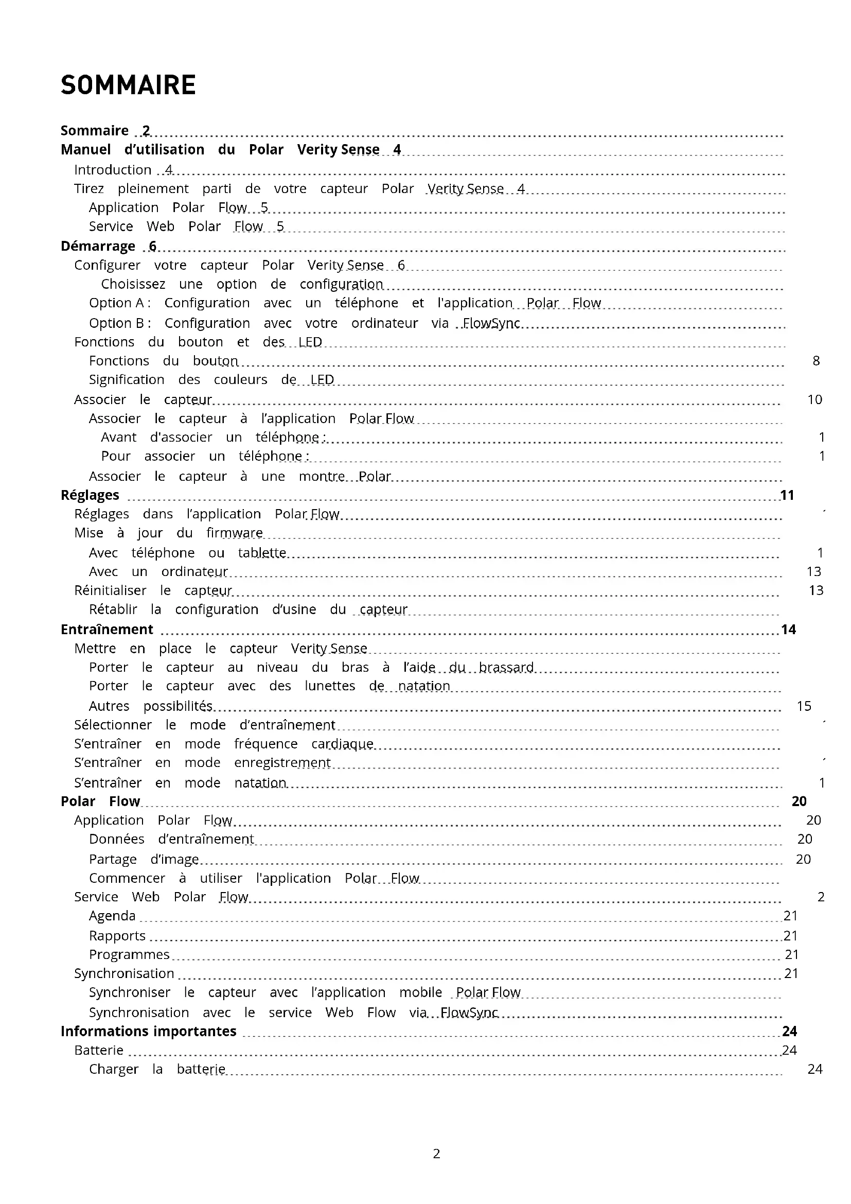 MANUEL D'UTILISATION2 SOMMAIRE Sommaire 2 Manuel d’utilisation du Polar VeritySense 4 Introduction 4 Tirez pleinement parti de votre capteur Polar VeritySense 4 Application Polar Flow 5 Service Web Polar Flow 5 Démarrage 6 Configurer votre capteur Polar VeritySense 6 Choisissez une option de configuration 6 OptionA: Configuration avec un téléphone et l'application Polar Flow 6 OptionB: Configuration avec votre ordinateur via FlowSync 6 Fonctions du bouton et des LED 8 Fonctions du bouton 8 Signification des couleurs de LED 8 Associer le capteur 10 Associer le capteur à l’application PolarFlow 10 Avant d'associer un téléphone: 10 Pour associer un téléphone: 10 Associer le capteur à une montre Polar 10 Réglages 11 Réglages dans l’application PolarFlow 11 Mise à jour du firmware 12 Avec téléphone ou tablette 12 Avec un ordinateur 13 Réinitialiser le capteur 13 Rétablir la configuration d’usine du capteur 13 Entraînement 14 Mettre en place le capteur VeritySense 14 Porter le capteur au niveau du bras à l’aide du brassard 14 Porter le capteur avec des lunettes de natation 14 Autres possibilités 15 Sélectionner le mode d’entraînement 15 S’entraîner en mode fréquence cardiaque 16 S’entraîner en mode enregistrement 17 S’entraîner en mode natation 18 Polar Flow 20 Application Polar Flow 20 Données d’entraînement 20 Partage d’image 20 Commencer à utiliser l'application Polar Flow 20 Service Web Polar Flow 21 Agenda 21 Rapports 21 Programmes 21 Synchronisation 21 Synchroniser le capteur avec l’application mobile PolarFlow 22 Synchronisation avec le service Web Flow via FlowSync 22 Informations importantes 24 Batterie 24 Charger la batterie 243 Entretenir votre capteur Polar VeritySense 25 Nettoyer votre capteur VeritySense 25 Rangement 26 Service après-vente 26 Précautions d'emploi 27 Interférences pendant l’entraînement 27 Santé et entraînement 27 Attention 28 Utiliser votre produit Polar en toute sécurité 28 Caractéristiques techniques 29 Polar VeritySense 29 Logiciel Polar FlowSync 30 Compatibilité de l'application mobile Polar Flow 30 Étanchéité des produits Polar 30 Informations réglementaires 31 Garantie internationale Polar 31 Décharge de responsabilité 324