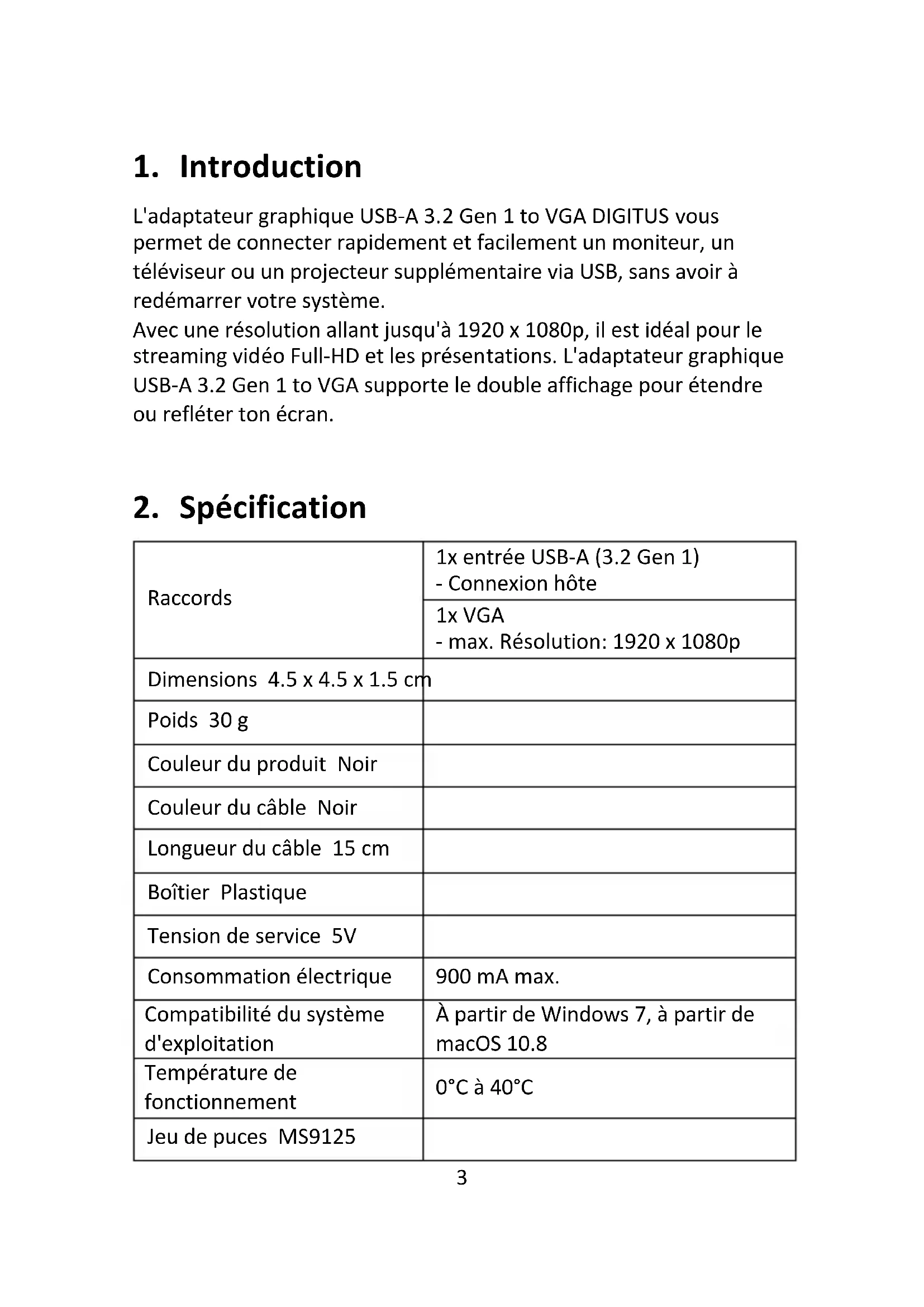 Raccords 1x entrée USB-A (3.2 Gen 1) - Connexion hôte 1x VGA - max. Résolution: 1920 x 1080p Dimensions 4.5 x 4.5 x 1.5 cm Poids 30 g Couleur du produit Noir Couleur du câble Noir Longueur du câble 15 cm Boîtier Plastique Tension de service 5V Consommation électrique 900 mA max. Compatibilité du système d'exploitation À partir de Windows 7, à partir de macOS 10.8 Température de fonctionnement 0°C à 40°C Jeu de puces MS91254