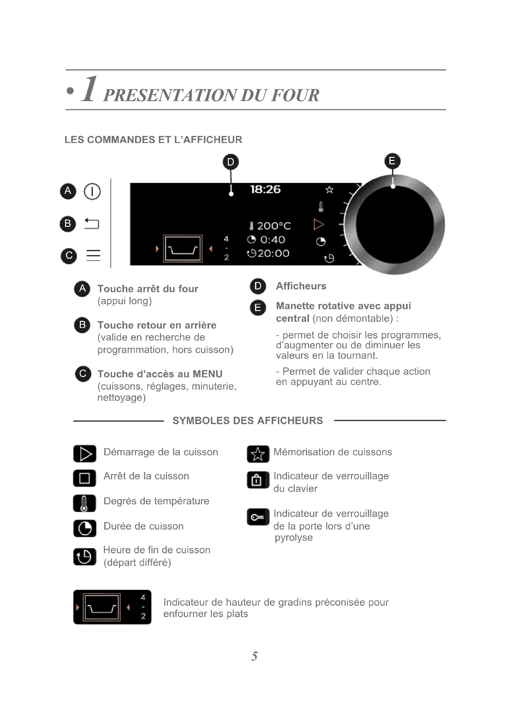 Touche arrêt du four (appui long) Touche retour en arrière (valide en recherche de programmation, hors cuisson) Touche d’accès au MENU (cuissons, réglages, minuterie, nettoyage) Afcheurs Manette rotative avec appui central (non démontable) : - permet de choisir les programmes, d’augmenter ou de diminuer les valeurs en la tournant. - Permet de valider chaque action en appuyant au centre.