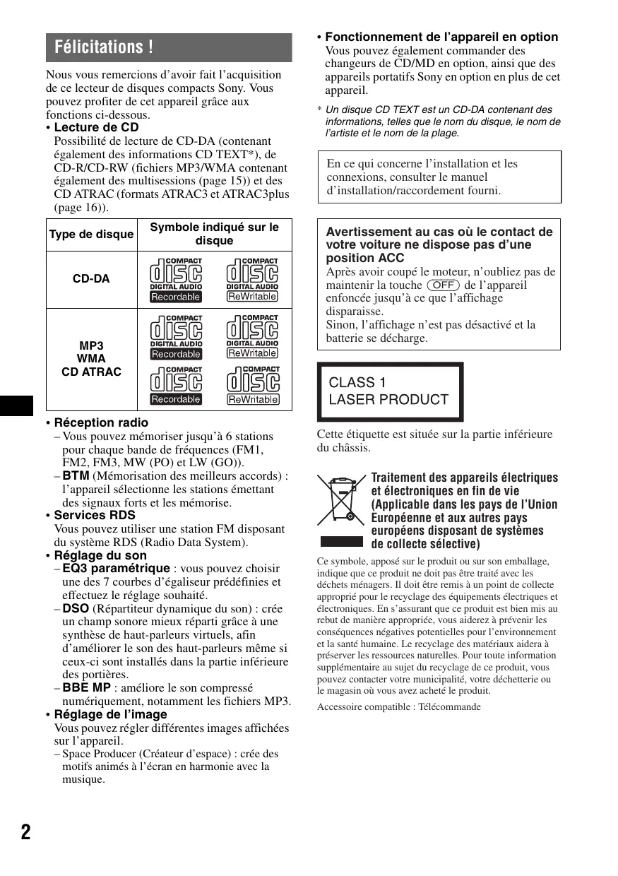 - Un disque CD TEXT est un CD-DA contenant des informations, telles que le nom du disque, le nom de l’artiste et le nom de la plage. En ce qui concerne l’installation et les connexions, consulter le manuel d’installation/raccordement fourni. Avertissement au cas où le contact de votre voiture ne dispose pas d’une position ACC Après avoir coupé le moteur, n’oubliez pas de maintenir la touche (OFF) de l’appareil enfoncée jusqu’à ce que l’affichage disparaisse. Sinon, l’affichage n’est pas désactivé et la batterie se décharge. Cette étiquette est située sur la partie inférieure du châssis. Traitement des appareils électriques et électroniques en fin de vie (Applicable dans les pays de l’Union Européenne et aux autres pays européens disposant de systèmes de collecte sélective) Ce symbole, apposé sur le produit ou sur son emballage, indique que ce produit ne doit pas être traité avec les déchets ménagers. Il doit être remis à un point de collecte approprié pour le recyclage des équipements électriques et électroniques. En s’assurant que ce produit est bien mis au rebut de manière appropriée, vous aiderez à prévenir les conséquences négatives potentielles pour l’environnement et la santé humaine. Le recyclage des matériaux aidera à préserver les ressources naturelles. Pour toute information supplémentaire au sujet du recyclage de ce produit, vous pouvez contacter votre municipalité, votre déchetterie ou le magasin où vous avez acheté le produit. Accessoire compatible : Télécommande Table des matières Préparation Autres fonctions Réinitialisation de l’appareil . . . . . . . . . . . . . . . 4 Réglage de l’horloge . . . . . . . . . . . . . . . . . . . . . 4 Retrait de la façade . . . . . . . . . . . . . . . . . . . . . . 4 Installation de la façade . . . . . . . . . . . . . . . . 5 Insertion du disque dans l’appareil . . . . . . . . . . 5 Ejection du disque. . . . . . . . . . . . . . . . . . . . . 5 Modification des caractéristiques du son . . . . 11 Réglage des caractéristiques du son . . . . . . 11 Personnalisation de la courbe de l’égaliseur — EQ3 . . . . . . . . . . . . . . . . . . . . . . . . . . . . 11 Réglage des paramètres de configuration — SET . . . . . . . . . . . . . . . . . . . . . . . . . . . . . . 12 Utilisation d’un appareil en option . . . . . . . . . 13 Changeur CD/MD . . . . . . . . . . . . . . . . . . . 13 Satellite de commande RM-X4S . . . . . . . . 13 Appareil audio auxiliaire . . . . . . . . . . . . . . 14 Emplacement des commandes et opérations de base Appareil principal . . . . . . . . . . . . . . . . . . . . . 6 Mini-télécommande RM-X151. . . . . . . . . . . 6