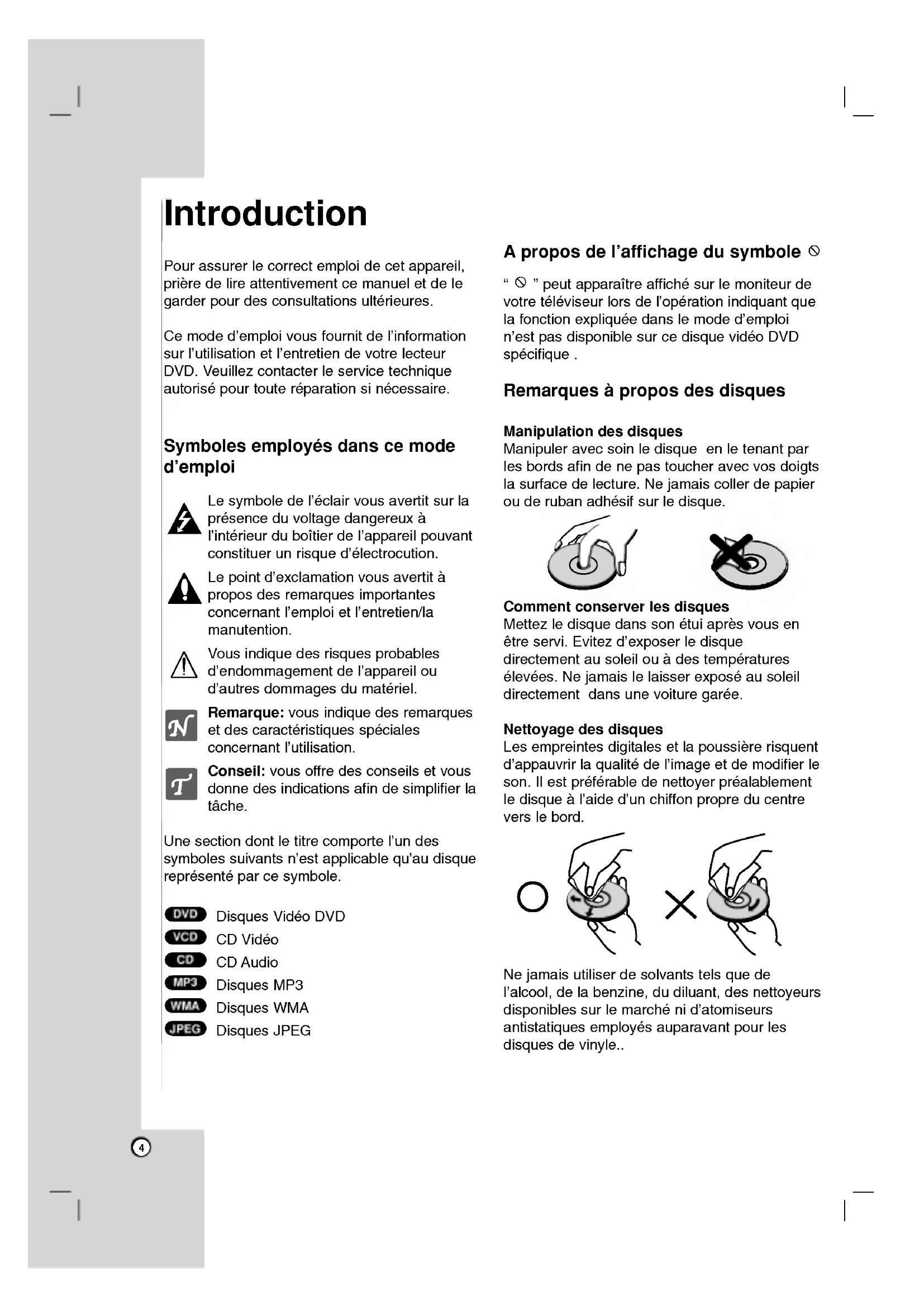 - Specifications Pourassurerlecorrect emploi decet appareil, priere delireattentivementcemanueletdele garder pourdesconsultationsulterieures.Ce mode d'emploi vousfournitdel'informationsurl'utilisationetl'entretiendevotrelecteurDVD.Veuillezcontacterleservice technique autorisepourtoute reparation sinecessaire. Symboles employes dans mode d'emploi symbole del'eclairvousavertitsurla presence voltage dangereux al'interieurduboitierde l'appareil pouvant constituerun risque d'electrocution.Le point d'exclamationvousavertitaproposdesremarques importantes concernant l'emploi etl'entretien/lamanutention.Vous indique des risques probables d'endommagement l'appareil oud'autres dommages dumateriel. Remarque: vous indique desremarquesetdes caracteristiques speciales concernantl'utilisation. Conseil: vousoffredesconseilsetvousdonnedesindicationsafinde simplifier latache.Unesectiondontletitre comporte l'undes symboles suivantsn'est applicable qu'au disque represente parce symbole. Disques VideoDVDCDVideoCDAudio Disques MP3 Disques WMA Disques JPEG p. 284