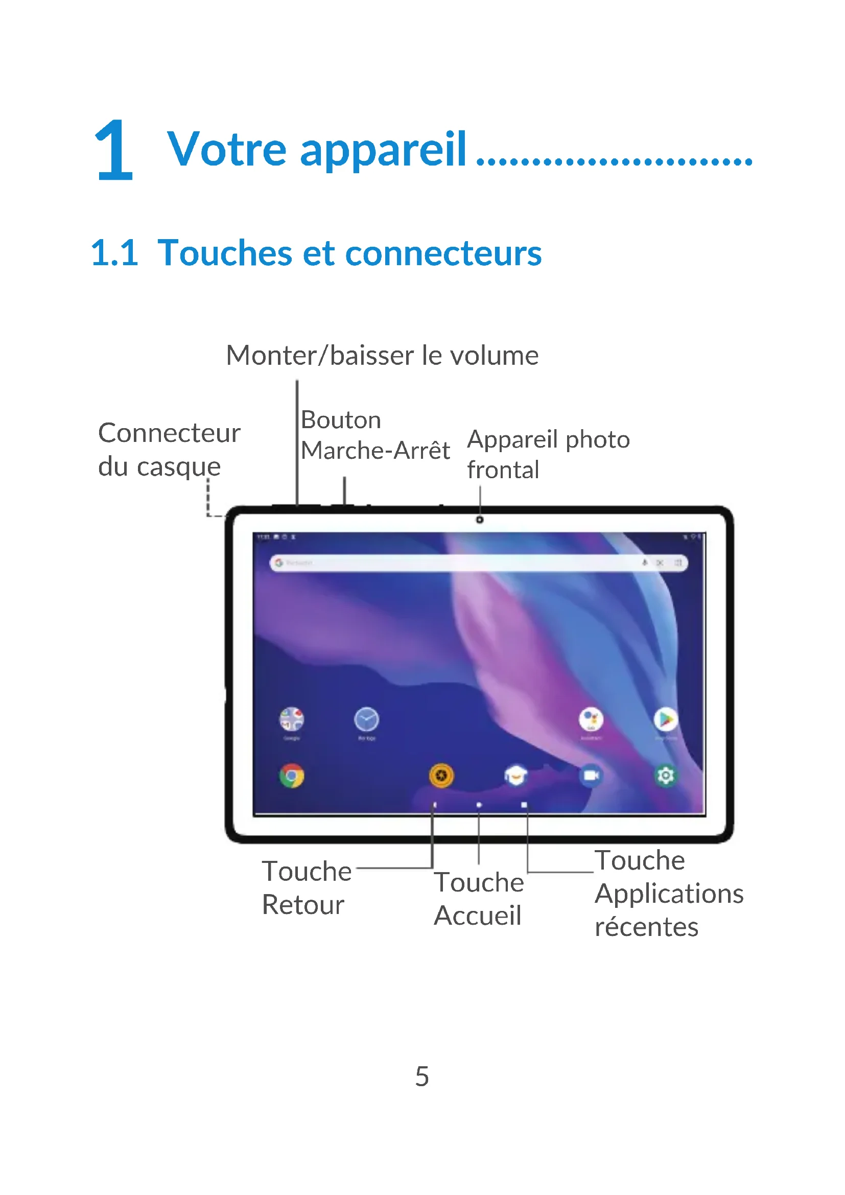 Connecteur du casque Appareil photo frontal Monter/baisser le volume Bouton Marche-Arrêt Touche Applications récentes Touche Accueil Touche Retour6 Appareil photo arrière Touche Retour