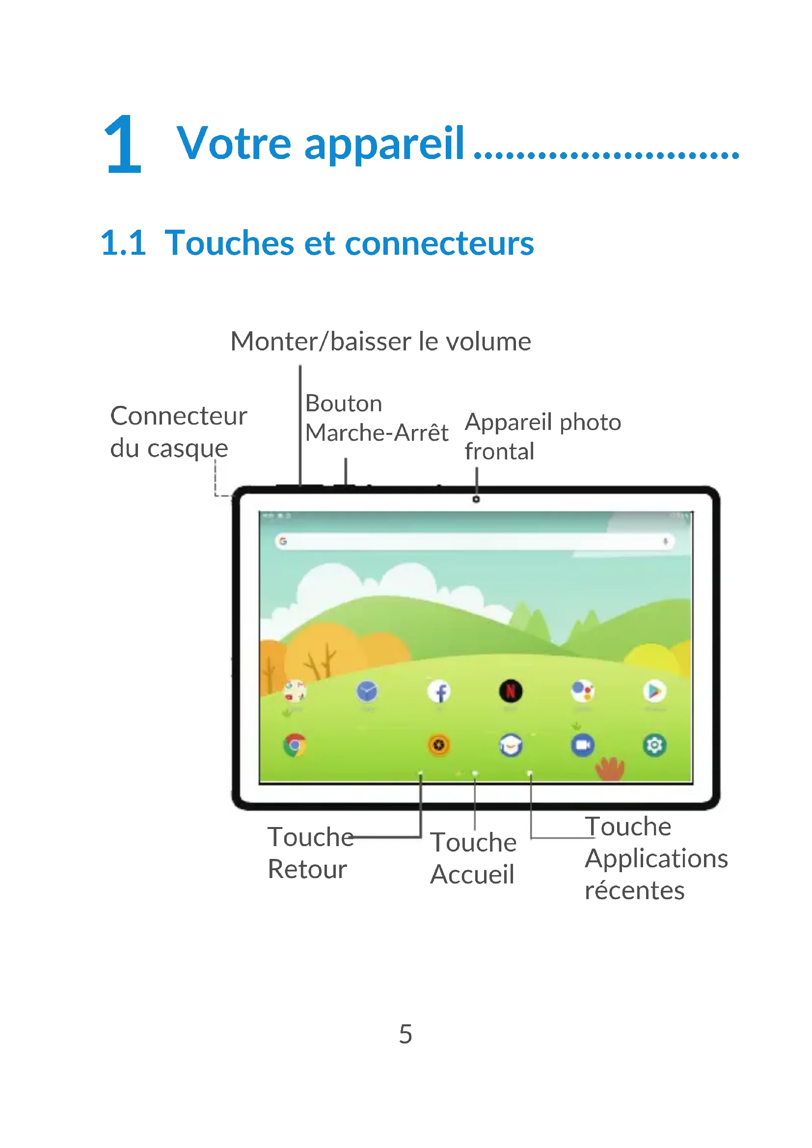 1.1 Touches et connecteurs 6 1.2 Mise en marche 10 1.3 Écran d'accueil 12