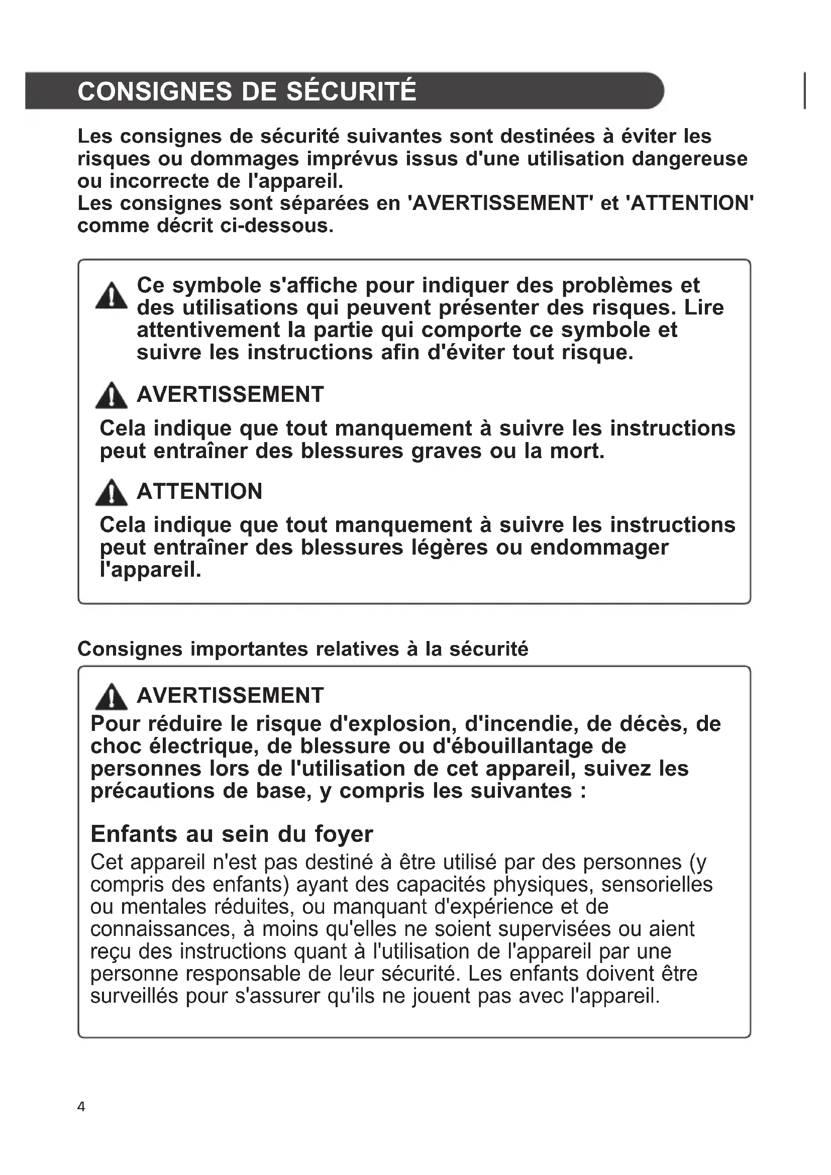Les consignes de sécurité suivantes sont destinées à éviter les risques ou dommages imprévus issus d'une utilisation dangereuse ou incorrecte de l'appareil. Les consignes sont séparées en 'AVERTISSEMENT' et 'ATTENTION' comme décrit ci-dessous. Ce symbole s'affiche pour indiquer des problèmes et des utilisations qui peuvent présenter des risques. Lire attentivement la partie qui comporte ce symbole et suivre les instructions afin d'éviter tout risque. AVERTISSEMENT Cela indique que tout manquement à suivre les instructions peut entraîner des blessures graves ou la mort. ATTENTION Cela indique que tout manquement à suivre les instructions peut entraîner des blessures légères ou endommager l'appareil. Consignes importantes relatives à la sécurité AVERTISSEMENT Pour réduire le risque d'explosion, d'incendie, de décès, de choc électrique, de blessure ou d'ébouillantage de personnes lors de l'utilisation de cet appareil, suivez les précautions de base, y compris les suivantes : Enfants au sein du foyer Cet appareil n'est pas destiné à être utilisé par des personnes (y compris des enfants) ayant des capacités physiques, sensorielles ou mentales réduites, ou manquant d'expérience et de connaissances, à moins qu'elles ne soient supervisées ou aient reçu des instructions quant à l'utilisation de l'appareil par une personne responsable de leur sécurité. Les enfants doivent être surveillés pour s'assurer qu'ils ne jouent pas avec l'appareil.5