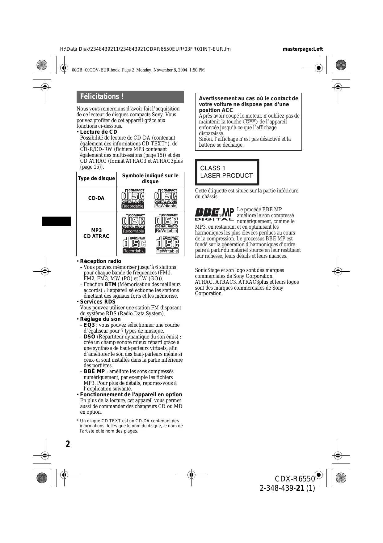 - Lecture de CD Possibilité de lecture de CD-DA (contenant également des informations CD TEXT*), de CD-R/CD-RW (fichiers MP3 contenant également des multisessions (page 15)) et des CD ATRAC (format ATRAC3 et ATRAC3plus (page 15)). Type de disque Avertissement au cas où le contact de votre voiture ne dispose pas d’une position ACC Après avoir coupé le moteur, n’oubliez pas de maintenir la touche (OFF) de l’appareil enfoncée jusqu’à ce que l’affichage disparaisse. Sinon, l’affichage n’est pas désactivé et la batterie se décharge. Symbole indiqué sur le disque CD-DA Cette étiquette est située sur la partie inférieure du châssis. Le procédé BBE MP améliore le son compressé numériquement, comme le MP3, en restaurant et en optimisant les harmoniques les plus élevées perdues au cours de la compression. Le processus BBE MP est fondé sur la génération d’harmoniques d’ordre paire à partir du matériel source en leur restituant leur richesse, leurs détails et leurs nuances.