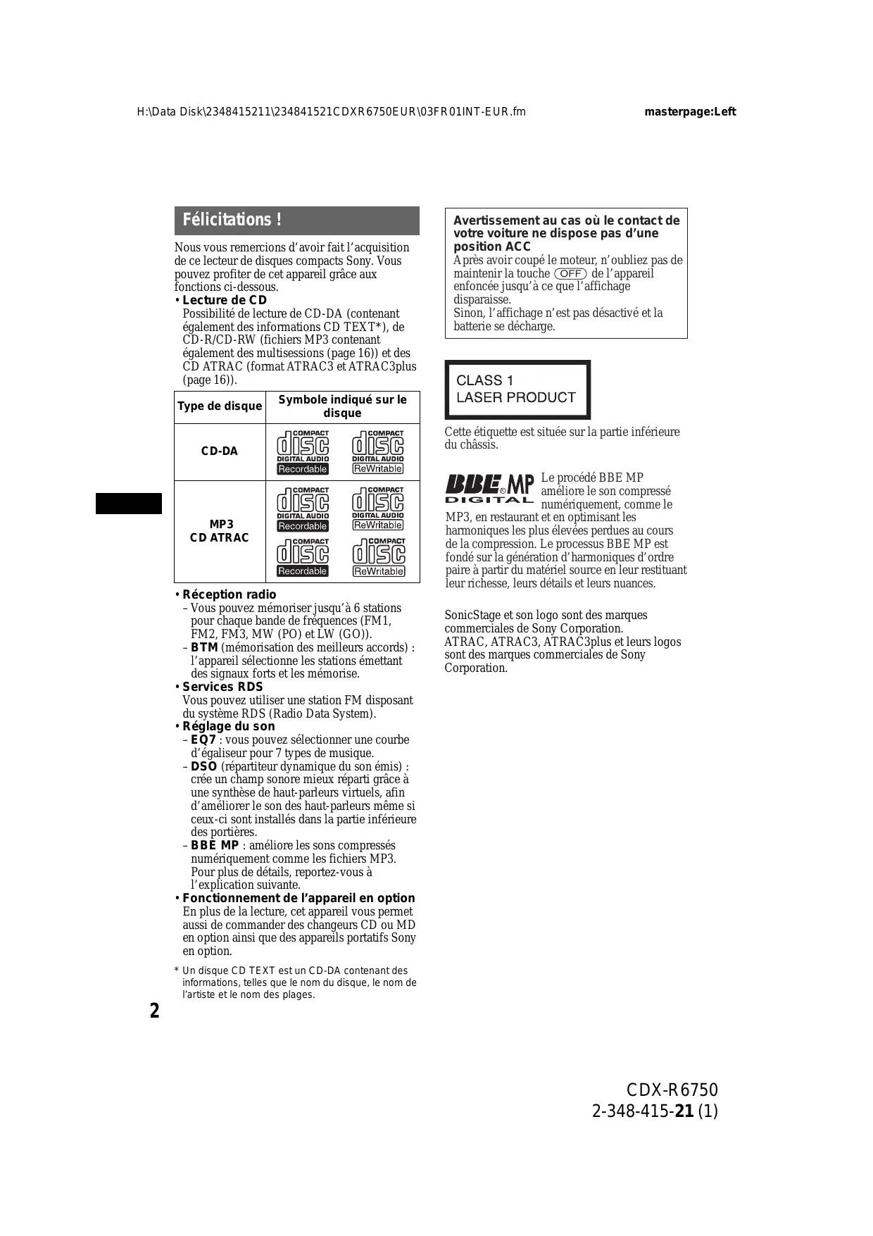 - Lecture de CD Possibilité de lecture de CD-DA (contenant également des informations CD TEXT*), de CD-R/CD-RW (fichiers MP3 contenant également des multisessions (page 16)) et des CD ATRAC (format ATRAC3 et ATRAC3plus (page 16)). Type de disque masterpage:Left Avertissement au cas où le contact de votre voiture ne dispose pas d’une position ACC Après avoir coupé le moteur, n’oubliez pas de maintenir la touche (OFF) de l’appareil enfoncée jusqu’à ce que l’affichage disparaisse. Sinon, l’affichage n’est pas désactivé et la batterie se décharge. Symbole indiqué sur le disque CD-DA Cette étiquette est située sur la partie inférieure du châssis. Le procédé BBE MP améliore le son compressé numériquement, comme le MP3, en restaurant et en optimisant les harmoniques les plus élevées perdues au cours de la compression. Le processus BBE MP est fondé sur la génération d’harmoniques d’ordre paire à partir du matériel source en leur restituant leur richesse, leurs détails et leurs nuances.