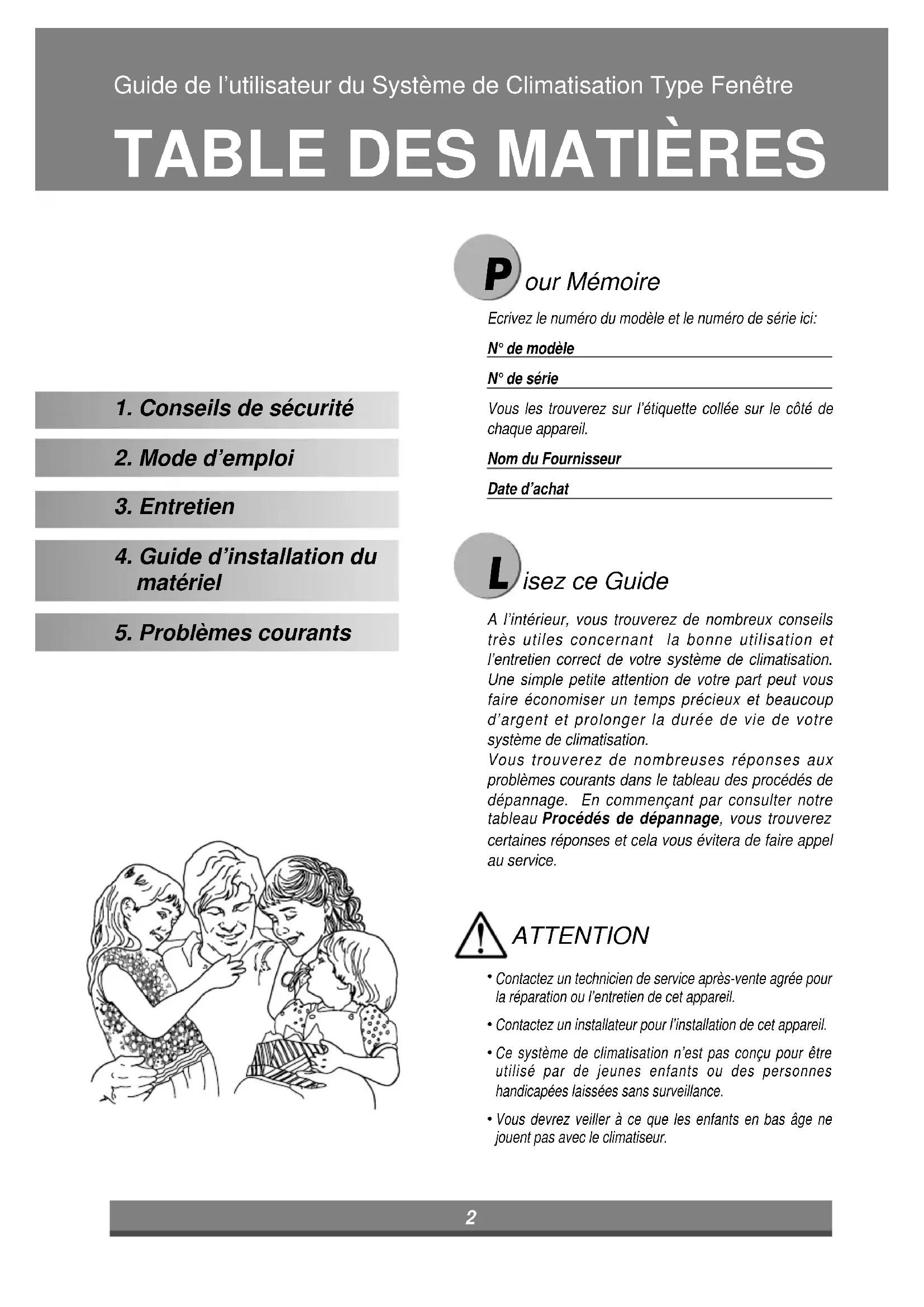 Ecrivez le numéro du modèle et le numéro de série ici:N° de modèle N° de série Vous les trouverez sur l’étiquette collée sur le côté dechaque appareil. Nom du FournisseurDate d’achatA l’intérieur, vous trouverez de nombreux conseilstrès utiles concernant la bonne utilisation etl’entretien correct de votre système de climatisation.Une simple petite attention de votre part peut vousfaire économiser un temps précieux et beaucoupd’argent et prolonger la durée de vie de votresystème de climatisation. Vous trouverez de nombreuses réponses auxproblèmes courants dans le tableau des procédés dedépannage. En commençant par consulter notretableau Procédés de dépannage, vous trouverezcertaines réponses et cela vous évitera de faire appelau service. Contactez un technicien de service après-vente agrée pourla réparation ou l’entretien de cet appareil. Contactez un installateur pour l’installation de cet appareil. Ce système de climatisation n’est pas conçu pour êtreutilisé par de jeunes enfants ou des personneshandicapées laissées sans surveillance. Vous devrez veiller à ce que les enfants en bas âge nejouent pas avec le climatiseur.MISE EN GARDE