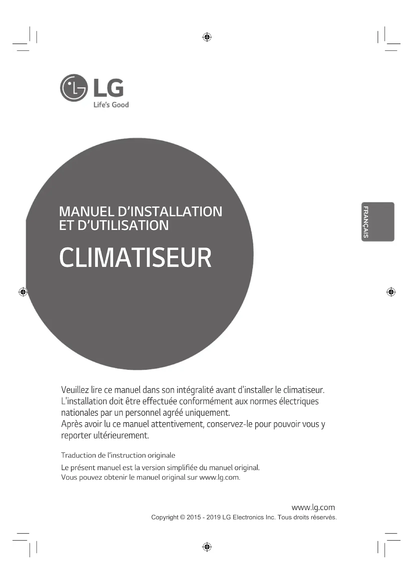 Traduction de l’instruction originale Le présent manuel est la version simplifiée du manuel original. Vous pouvez obtenir le manuel original sur www.lg.com. CLIMATISEUR www.lg.com Veuillez lire ce manuel dans son intégralité avant d'installer le climatiseur. L'installation doit être effectuée conformément aux normes électriques nationales par un personnel agréé uniquement. Après avoir lu ce manuel attentivement, conservez-le pour pouvoir vous y reporter ultérieurement. Copyright © 2015 - 2019 LG Electronics Inc. Tous droits réservés. FRANÇAIS2