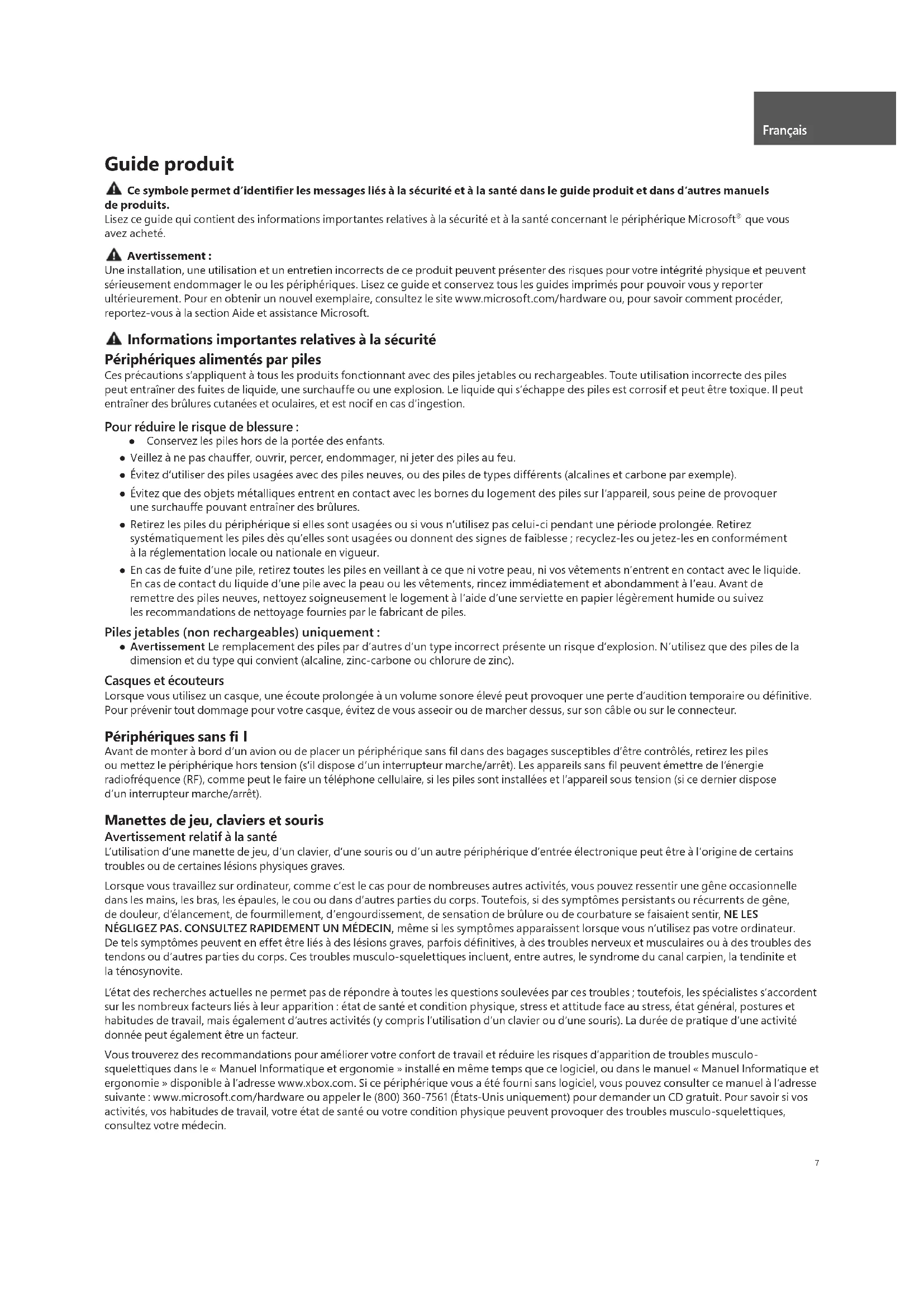 Une installation, une utilisation et un entretien incorrects de ce produit peuvent présenter des risques pour votre intégrité physique et peuvent sérieusement endommager le ou les périphériques. Lisez ce guide et conservez tous les guides imprimés pour pouvoir vous y reporter ultérieurement. Pour en obtenir un nouvel exemplaire, consultez le site www.microsoft.com/hardware ou, pour savoir comment procéder, reportez-vous à la section Aide et assistance Microsoft. Informations importantes relatives à la sécurité Périphériques alimentés par piles Ces précautions s’appliquent à tous les produits fonctionnant avec des piles jetables ou rechargeables. Toute utilisation incorrecte des piles peut entraîner des fuites de liquide, une surchauffe ou une explosion. Le liquide qui s’échappe des piles est corrosif et peut être toxique. Il peut entraîner des brûlures cutanées et oculaires, et est nocif en cas d’ingestion. Pour réduire le risque de blessure : ● Conservez les piles hors de la portée des enfants. ● Veillez à ne pas chauffer, ouvrir, percer, endommager, ni jeter des piles au feu. ● Évitez d’utiliser des piles usagées avec des piles neuves, ou des piles de types différents (alcalines et carbone par exemple). ● Évitez que des objets métalliques entrent en contact avec les bornes du logement des piles sur l’appareil, sous peine de provoquer une surchauffe pouvant entraîner des brûlures. ● Retirez les piles du périphérique si elles sont usagées ou si vous n’utilisez pas celui-ci pendant une période prolongée. Retirez systématiquement les piles dès qu’elles sont usagées ou donnent des signes de faiblesse ; recyclez-les ou jetez-les en conformément à la réglementation locale ou nationale en vigueur. ● En cas de fuite d’une pile, retirez toutes les piles en veillant à ce que ni votre peau, ni vos vêtements n’entrent en contact avec le liquide. En cas de contact du liquide d’une pile avec la peau ou les vêtements, rincez immédiatement et abondamment à l’eau. Avant de remettre des piles neuves, nettoyez soigneusement le logement à l’aide d’une serviette en papier légèrement humide ou suivez les recommandations de nettoyage fournies par le fabricant de piles. Piles jetables (non rechargeables) uniquement : ● Avertissement Le remplacement des piles par d’autres d’un type incorrect présente un risque d’explosion. N’utilisez que des piles de la dimension et du type qui convient (alcaline, zinc-carbone ou chlorure de zinc). Casques et écouteurs Lorsque vous utilisez un casque, une écoute prolongée à un volume sonore élevé peut provoquer une perte d’audition temporaire ou défi nitive. Pour prévenir tout dommage pour votre casque, évitez de vous asseoir ou de marcher dessus, sur son câble ou sur le connecteur. Périphériques sans fi l Avant de monter à bord d’un avion ou de placer un périphérique sans fi l dans des bagages susceptibles d’être contrôlés, retirez les piles ou mettez le périphérique hors tension (s’il dispose d’un interrupteur marche/arrêt). Les appareils sans fi l peuvent émettre de l’énergie radiofréquence (RF), comme peut le faire un téléphone cellulaire, si les piles sont installées et l’appareil sous tension (si ce dernier dispose d’un interrupteur marche/arrêt). Manettes de jeu, claviers et souris Avertissement relatif à la santé L’utilisation d’une manette de jeu, d’un clavier, d’une souris ou d’un autre périphérique d’entrée électronique peut être à l’origine de certains troubles ou de certaines lésions physiques graves. Lorsque vous travaillez sur ordinateur, comme c’est le cas pour de nombreuses autres activités, vous pouvez ressentir une gêne occasionnelle dans les mains, les bras, les épaules, le cou ou dans d’autres parties du corps. Toutefois, si des symptômes persistants ou récurrents de gêne, de douleur, d’élancement, de fourmillement, d’engourdissement, de sensation de brûlure ou de courbature se faisaient sentir, NE LES NÉGLIGEZ PAS. CONSULTEZ RAPIDEMENT UN MÉDECIN, même si les symptômes apparaissent lorsque vous n’utilisez pas votre ordinateur. De tels symptômes peuvent en effet être liés à des lésions graves, parfois défi nitives, à des troubles nerveux et musculaires ou à des troubles des tendons ou d’autres parties du corps. Ces troubles musculo-squelettiques incluent, entre autres, le syndrome du canal carpien, la tendinite et la ténosynovite. L’état des recherches actuelles ne permet pas de répondre à toutes les questions soulevées par ces troubles ; toutefois, les spécialistes s’accordent sur les nombreux facteurs liés à leur apparition : état de santé et condition physique, stress et attitude face au stress, état général, postures et habitudes de travail, mais également d’autres activités (y compris l’utilisation d’un clavier ou d’une souris). La durée de pratique d’une activité donnée peut également être un facteur. Vous trouverez des recommandations pour améliorer votre confort de travail et réduire les risques d’apparition de troubles musculo- squelettiques dans le « Manuel Informatique et ergonomie » installé en même temps que ce logiciel, ou dans le manuel « Manuel Informatique et ergonomie » disponible à l’adresse www.xbox.com. Si ce périphérique vous a été fourni sans logiciel, vous pouvez consulter ce manuel à l’adresse suivante : www.microsoft.com/hardware ou appeler le (800) 360-7561 (États-Unis uniquement) pour demander un CD gratuit. Pour savoir si vos activités, vos habitudes de travail, votre état de santé ou votre condition physique peuvent provoquer des troubles musculo-squelettiques, consultez votre médecin. Français8 Crises d’épilepsie liées à la photosensibilité Pour un très faible pourcentage de personnes, l’exposition à certaines images, notamment les lumières ou les motifs clign