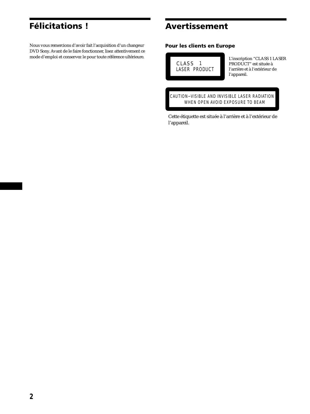 Félicitations ! Avertissement Nous vous remercions d’avoir fait l’acquisition d’un changeur DVD Sony. Avant de le faire fonctionner, lisez attentivement ce mode d’emploi et conservez le pour toute référence ultérieure. Pour les clients en Europe CLASS 1 LASER PRODUCT L’inscription “CLASS 1 LASER PRODUCT” est située à l’arrière et à l’extérieur de l’appareil.