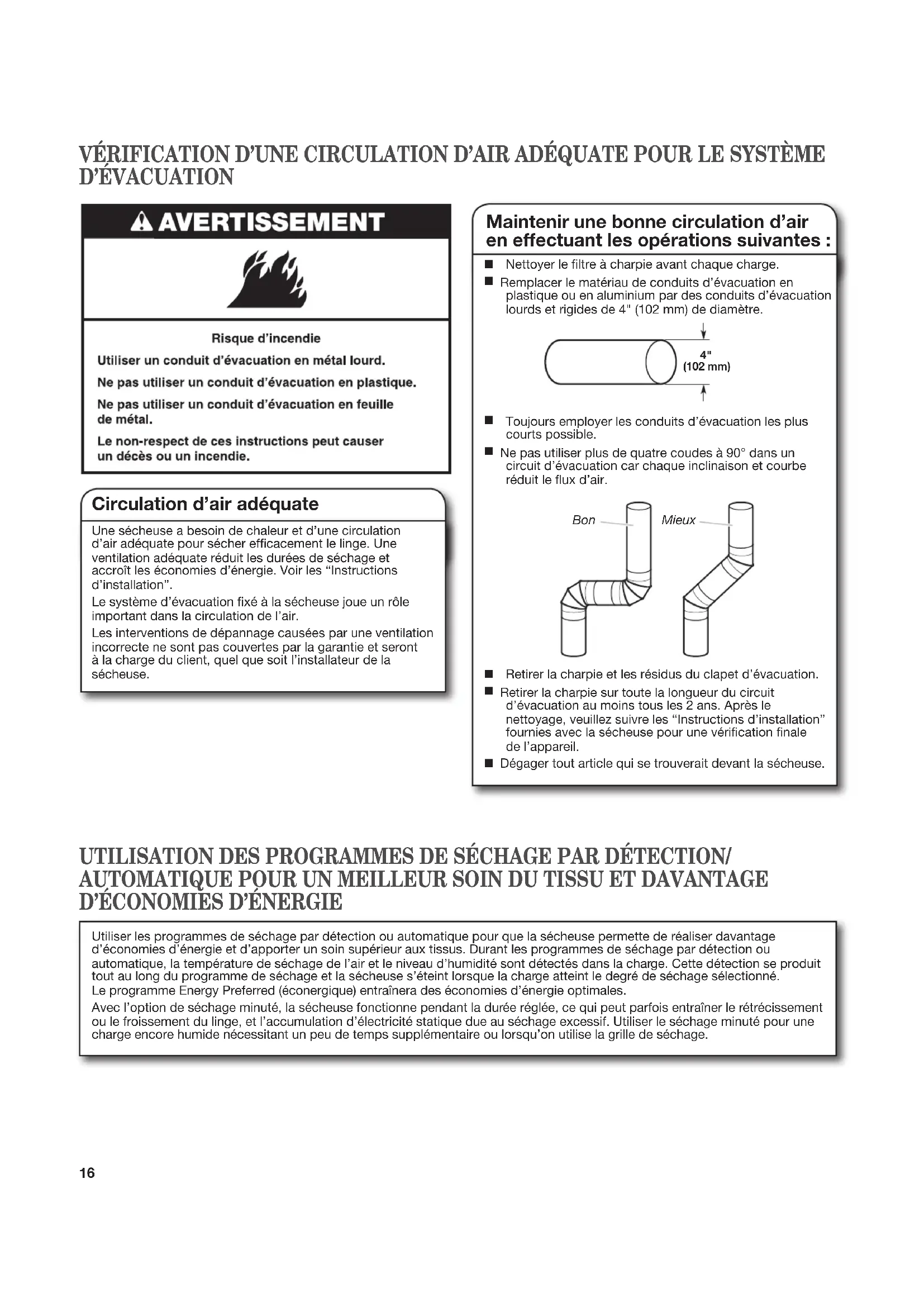Remplacer le matériau de conduits d’évacuation en plastique ou en aluminium par des conduits d’évacuation lourds et rigides de 4" (102 mm) de diamètre.