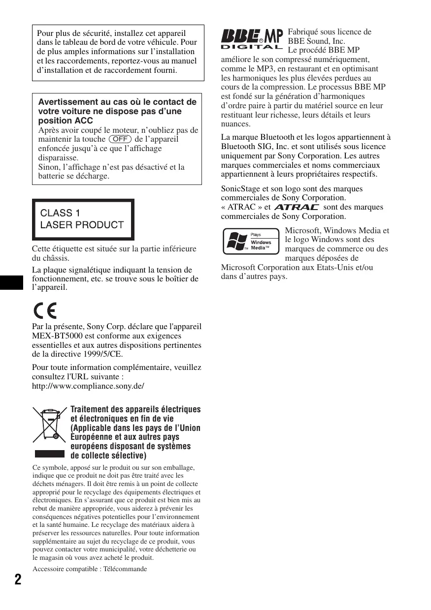 Par la présente, Sony Corp. déclare que l'appareil MEX-BT5000 est conforme aux exigences essentielles et aux autres dispositions pertinentes de la directive 1999/5/CE. Pour toute information complémentaire, veuillez consultez l'URL suivante : http://www.compliance.sony.de/