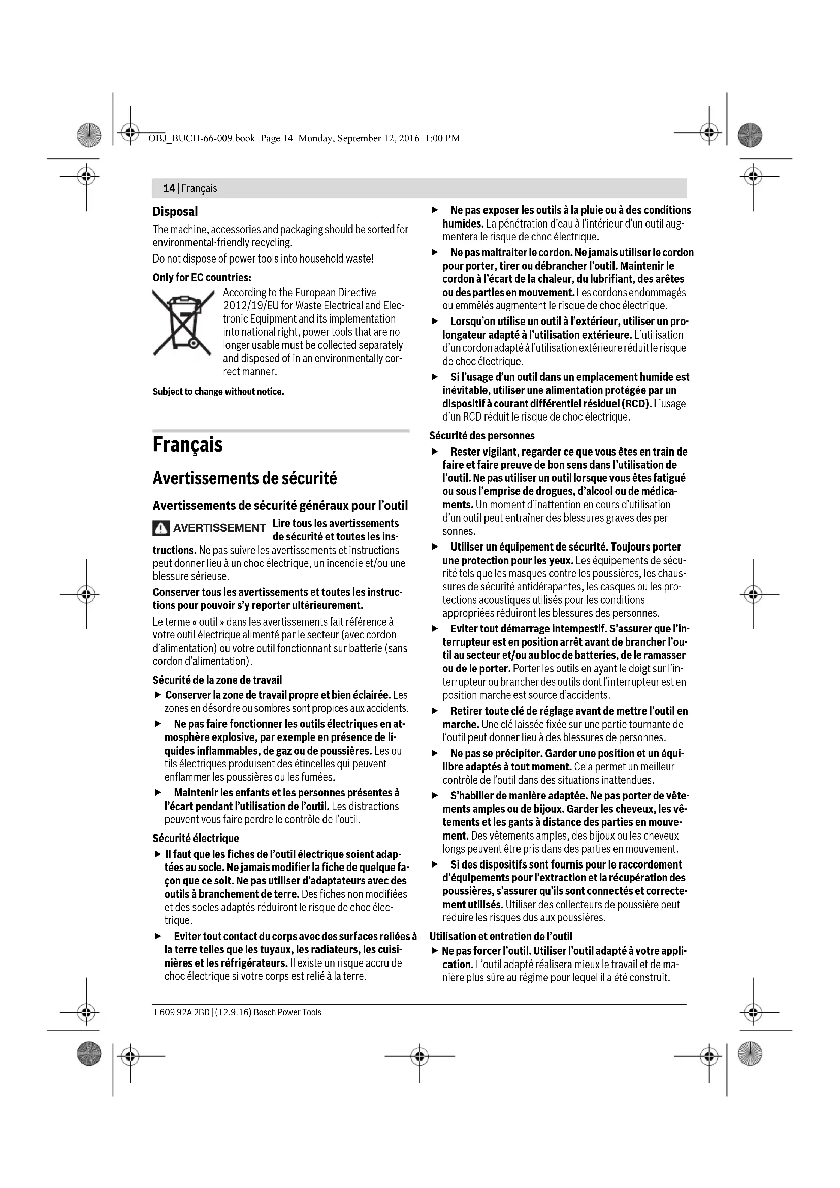 Ces indications sont valables pour une tension nominale de [U] 230 V. Ces indications peuvent varier pour des tensions plus basses ainsi que pour des versions spécifiques à certains pays. OBJ_BUCH-66-009.book Page 15 Monday, September 12, 2016 1:00 PM16 | Français 1 609 92A 2BD | (12.9.16) Bosch Power Tools Niveau sonore et vibrations Valeurs d’émissions sonores déterminées selon la norme EN 60745-2-6. Les mesures réelles (A) des niveaux sonores de l’appareil sont : Niveau de pression acoustique 89 dB(A) ; niveau d’in- tensité acoustique 100 dB(A). Incertitude K=3 dB. Porter une protection acoustique ! Valeurs totales des vibrations a
