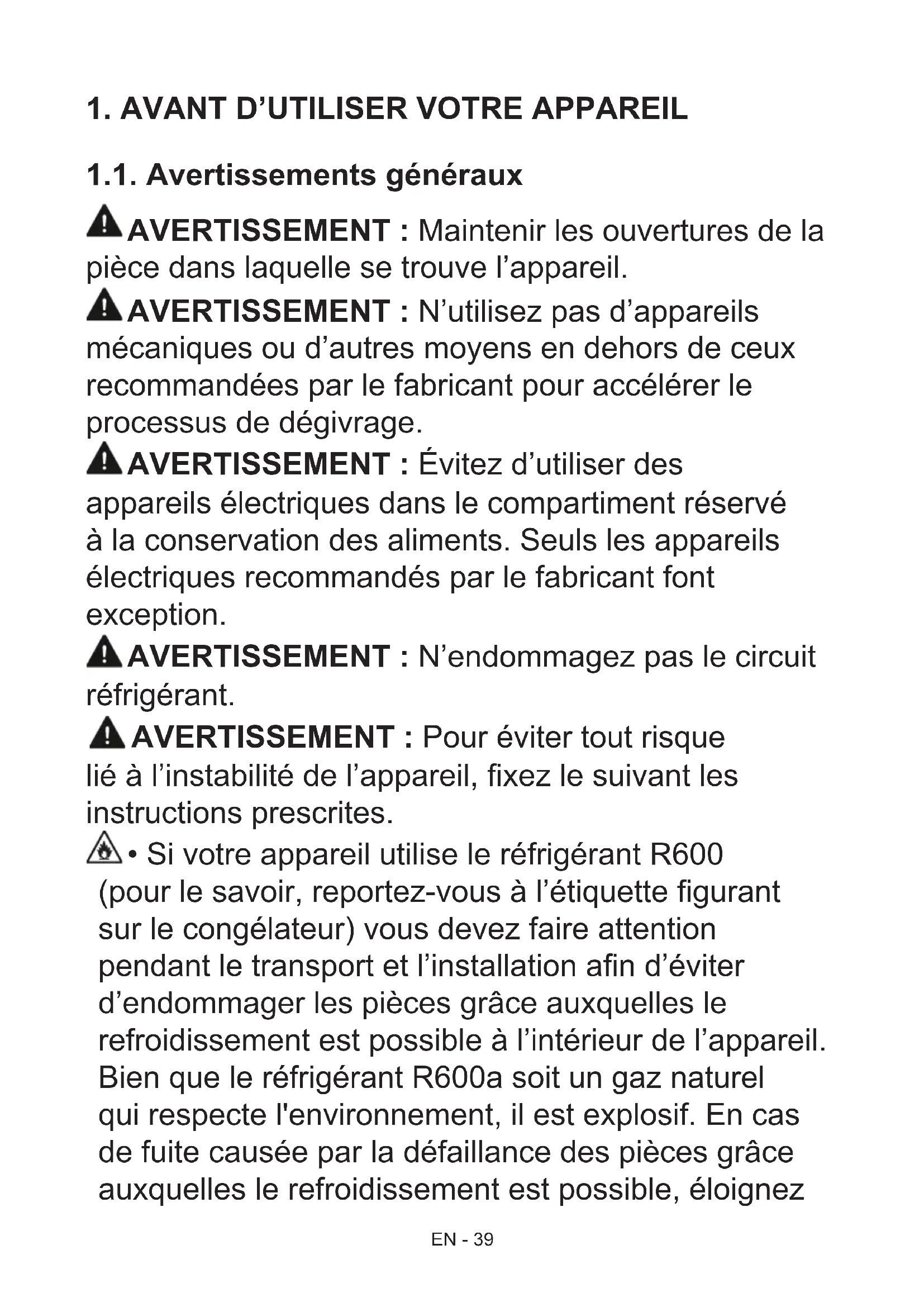 1.1. Avertissements généraux ............................................................................................39 1.2. Installation et utilisation de votre réfrigérateur .............................................................42 1.3. Avertissements en matière de sécurité ........................................................................43