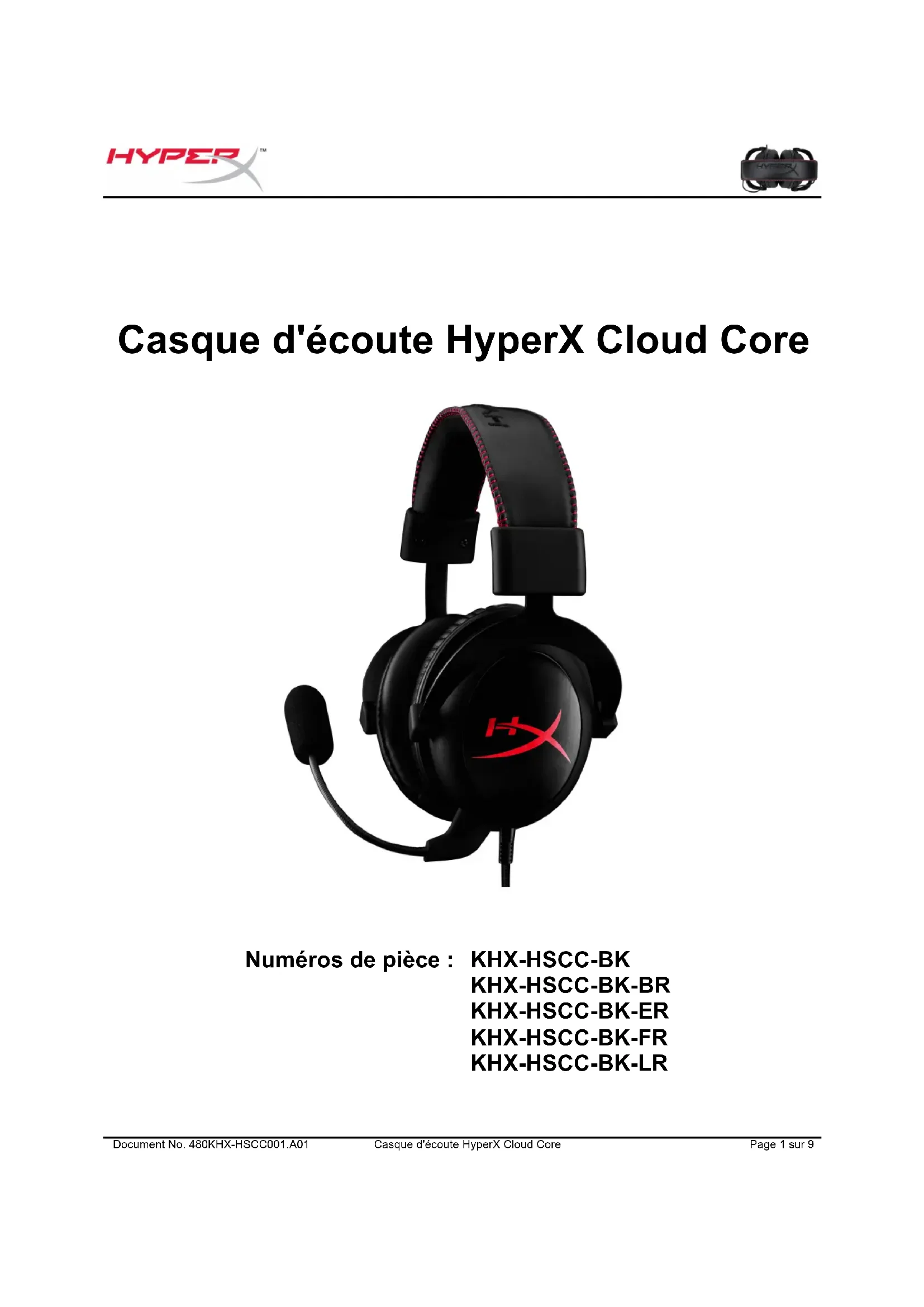 Numéros de pièce : KHX-HSCC-BK KHX-HSCC-BK-BR KHX-HSCC-BK-ER KHX-HSCC-BK-FR KHX-HSCC-BK-LRDocument No. 480KHX-HSCC001.A01 Casque d'écoute HyperX Cloud Core Page 2 sur 9