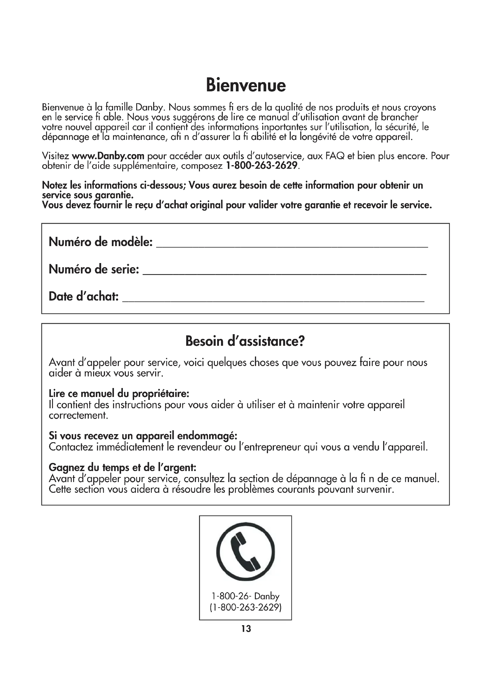 Danby soins du consommateur: 1-800-263-2629 Heures d’ouverture: Lundi à Jeudi 8 h 30 à 18 h, heure normale de l’Est Vendredi de 8 h 30 à 16 h, heure normale de l’Est Les informations contenues dans ce manuel sont sujettes à modifi cation sans préavis.