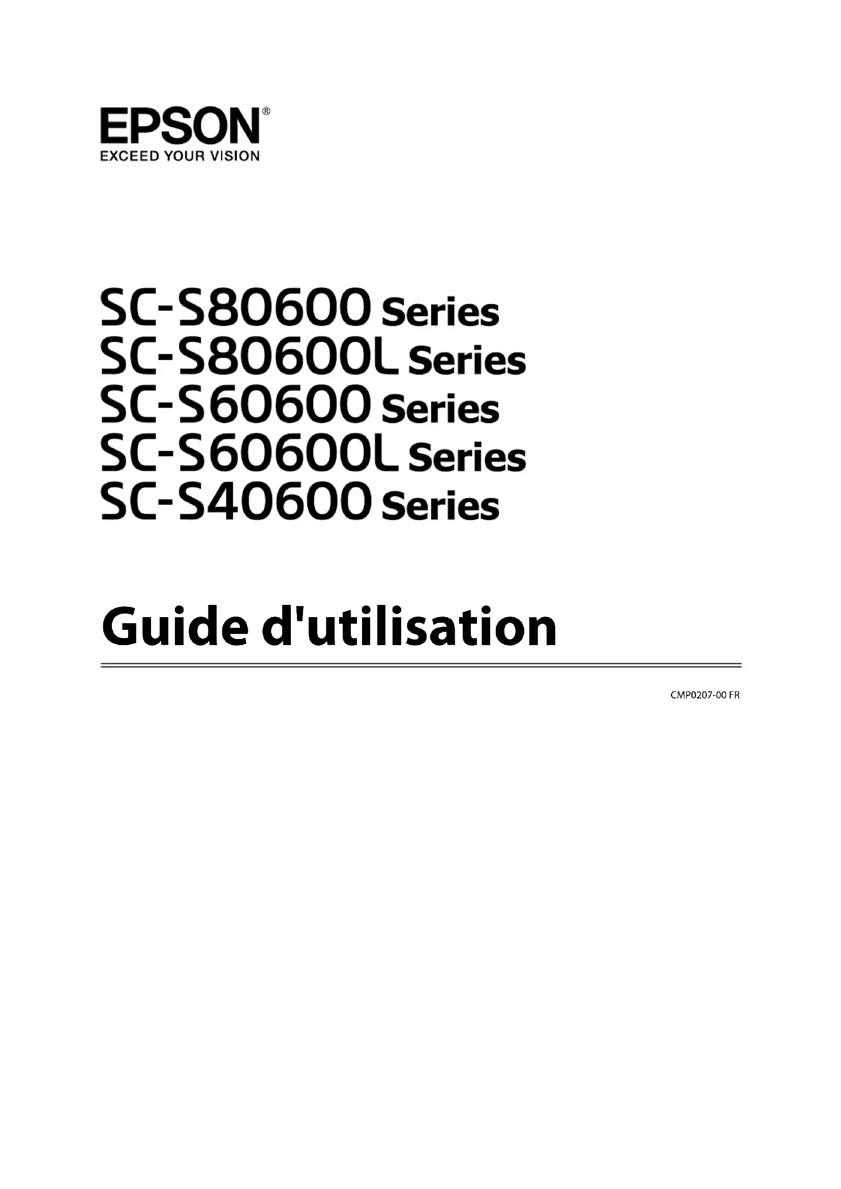 - , and other Pantone trademarks are the property of Pantone LLC. Pantone LLC, 2019. Avis général : les autres noms de produit utilisés dans cette notice sont donnés uniquement à titre d’identification et peuvent être des noms de marque de leurs détenteurs respectifs. Epson dénie toute responsabilité vis-à-vis de ces marques. © 2019 Seiko Epson Corporation SC-S80600 Series/SC-S80600L Series/SC-S60600 Series/SC-S60600L Series/SC-S40600 Series Guide d'utilisation Copyrights et marques 2Table des matières Copyrights et marques Introduction Éléments de l’imprimante p. 6