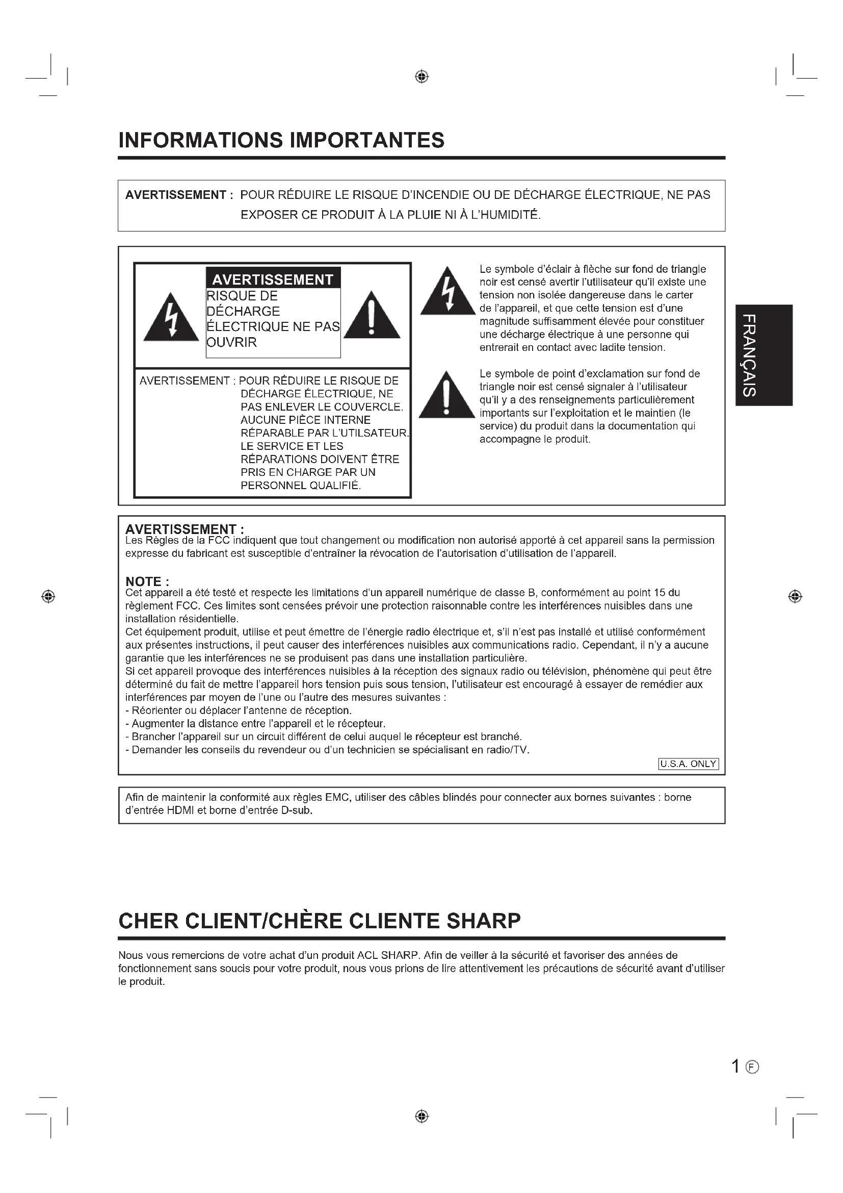Nous vous remercions de votre achat d’un produit ACL SHARP. An de veiller à la sécurité et favoriser des années de fonctionnement sans soucis pour votre produit, nous vous prions de lire attentivement les précautions de sécurité avant d’utiliser le produit.An de maintenir la conformité aux règles EMC, utiliser des câbles blindés pour connecter aux bornes suivantes : borne d’entrée HDMI et borne d’entrée D-sub. RISQUE DE DÉCHARGE