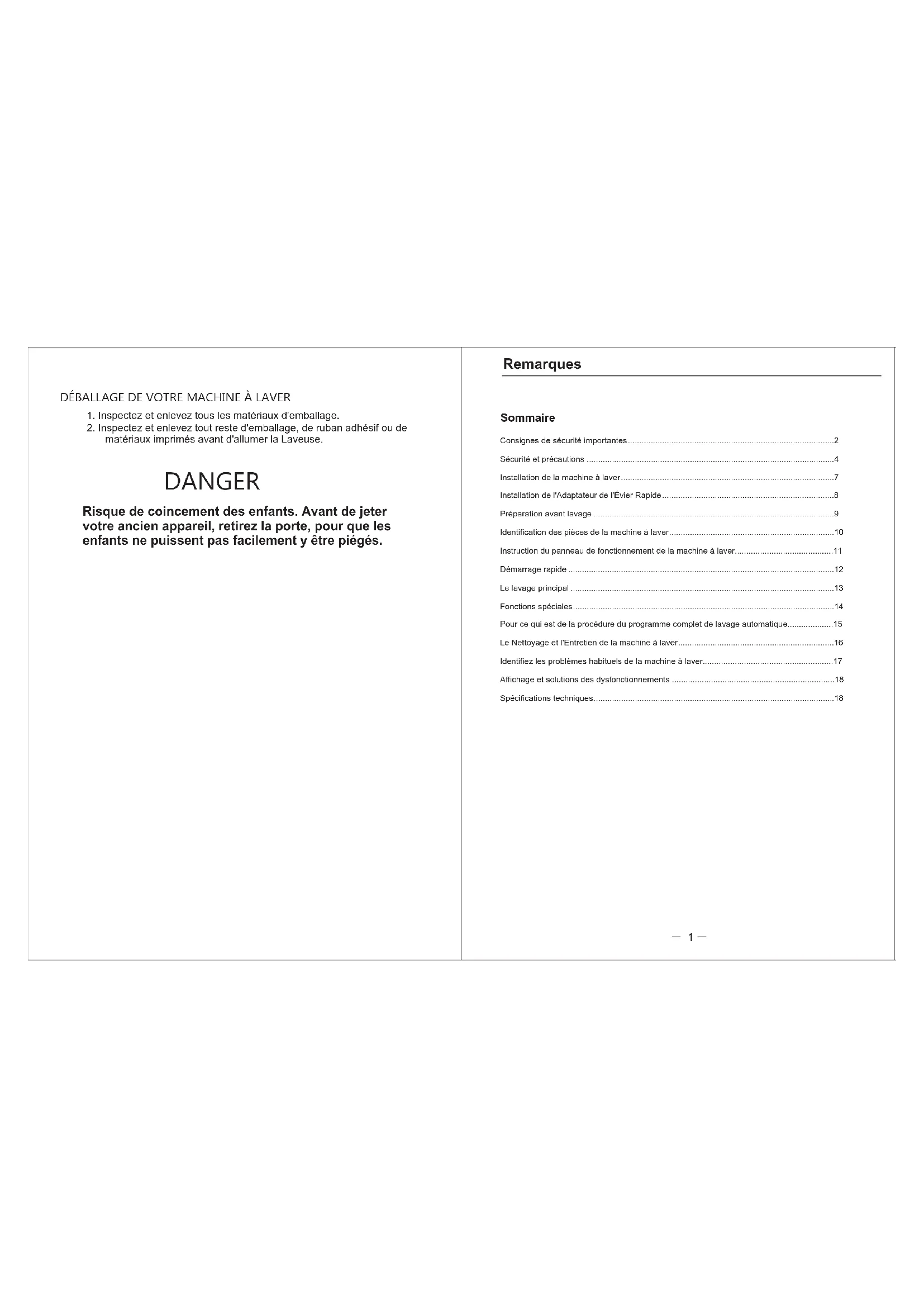 - DANGER 1. Inspectez et enlevez tous les matériaux d'emballage.2. Inspectez et enlevez tout reste d'emballage, de ruban adhésif ou de matériaux imprimés avant d'allumer la Laveuse. Risque de coincement des enfants. Avant de jeter votre ancien appareil, retirez la porte, pour que les enfants ne puissent pas facilement y être piégés. Consignes de sécurité importantes p. 2
