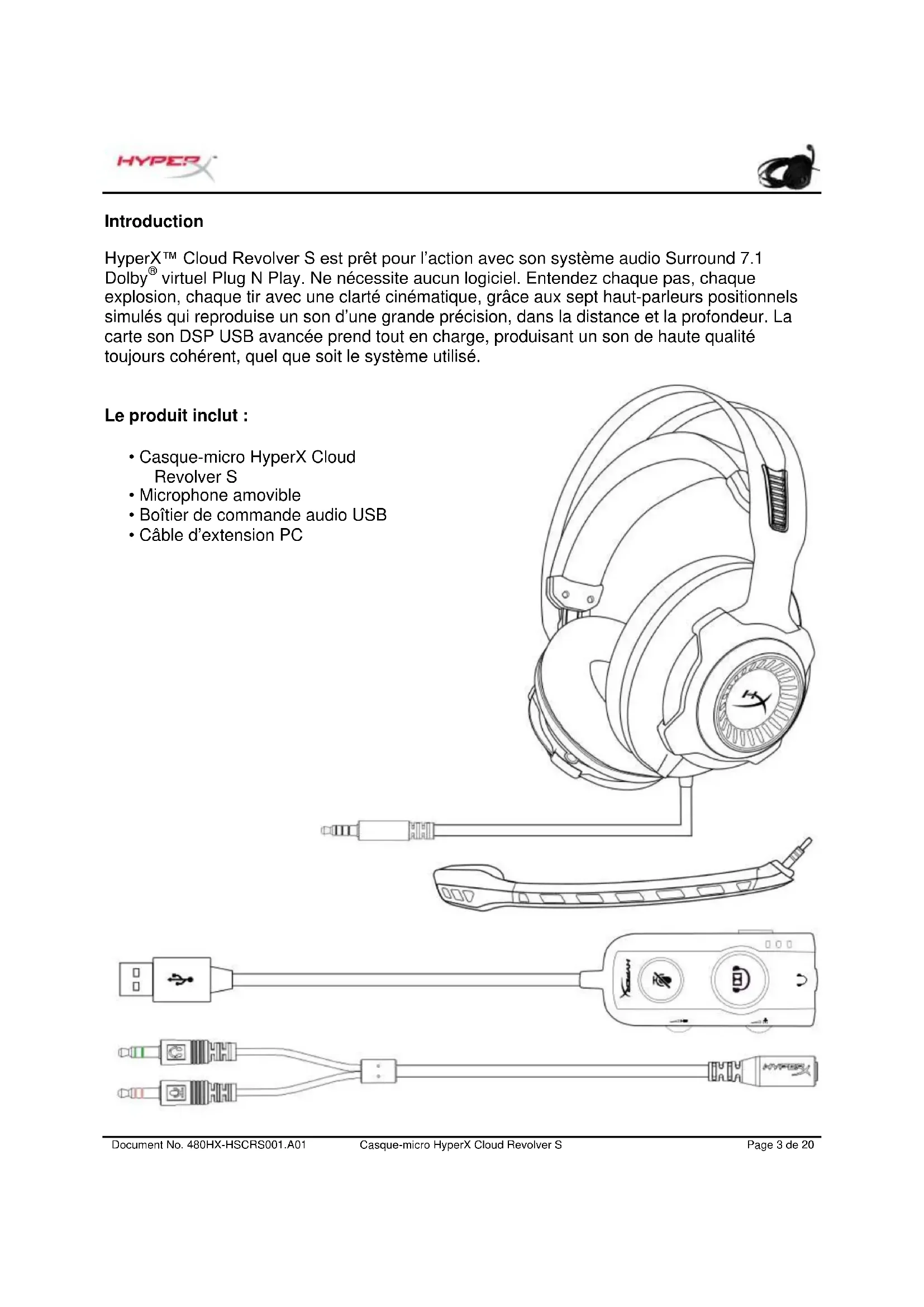 - Sensibilité : -40dBV (0dB=1V/Pa, 1kHz)Document No. 480HX-HSCRS001.A01 Casque-micro HyperX Cloud Revolver S Page 5 de 20 Présentation A. Structure acier durable B. Arceau suspendu C. Microphone amovible à réduction du bruit D. Câble fixe avec connecteur 3,5mm à 4 broches E. Boîtier de commande audio USB F. Câble d’extension PCDocument No. 480HX-HSCRS001.A01 Casque-micro HyperX Cloud Revolver S Page 6 de 20 Fonctionnement du boîtier de commande audio USB Caractéristiques du boîtier de commande audio USB