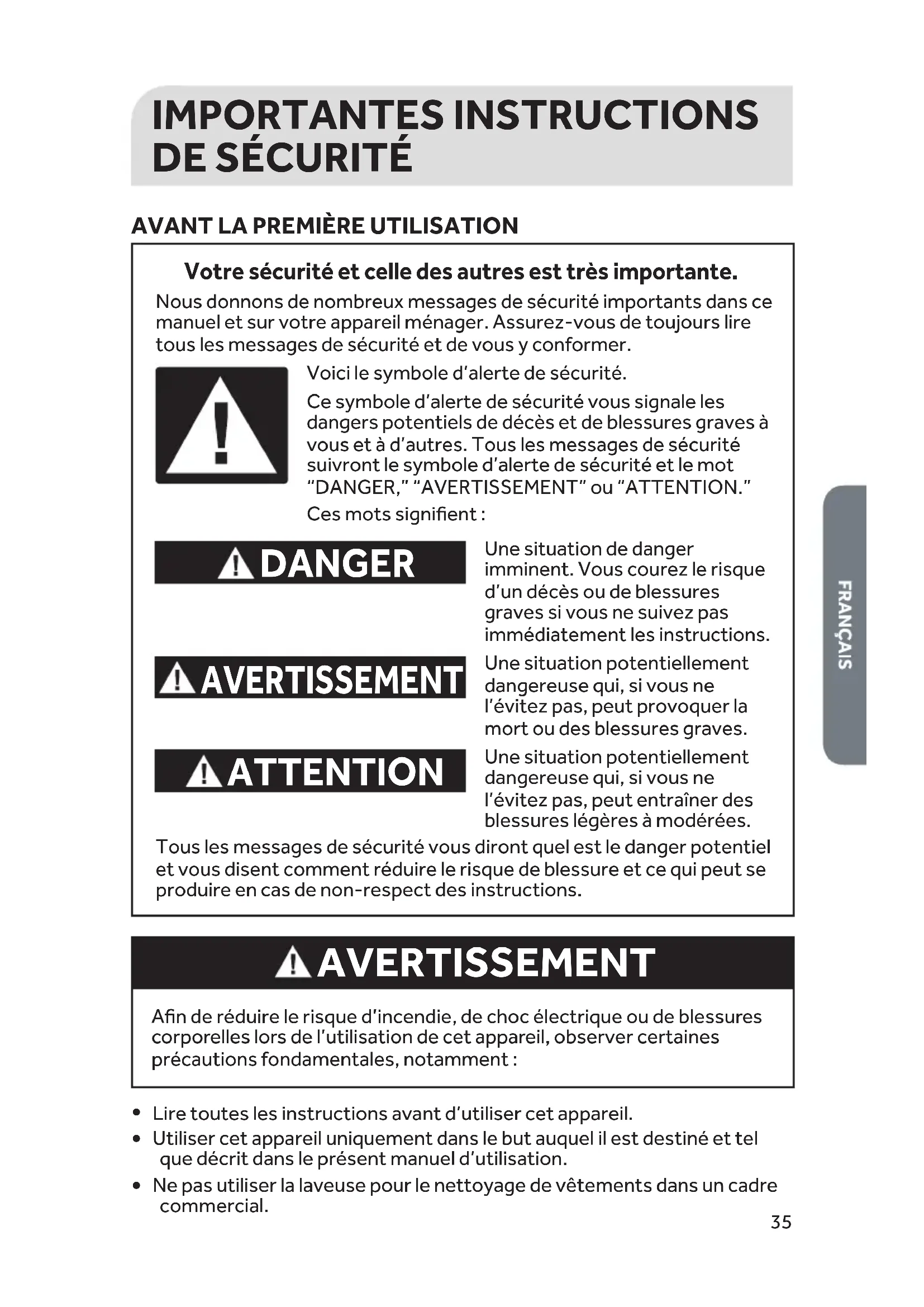 Votre sécurité et celle des autres est très importante. DANGER AVERTISSEMENT ATTENTION Voici le symbole d’alerte de sécurité. Ce symbole d’alerte de sécurité vous signale les dangers potentiels de décès et de blessures graves à vous et à d’autres. Tous les messages de sécurité suivront le symbole d’alerte de sécurité et le mot “DANGER,” “AVERTISSEMENT” ou “ATTENTION.” Ces mots signifient : Une situation de danger imminent. Vous courez le risque d’un décès ou de blessures graves si vous ne suivez pas immédiatement les instructions. Une situation potentiellement dangereuse qui, si vous ne l’évitez pas, peut provoquer la mort ou des blessures graves. Une situation potentiellement dangereuse qui, si vous ne l’évitez pas, peut entraîner des blessures légères à modérées. Tous les messages de sécurité vous diront quel est le danger potentiel et vous disent comment réduire le risque de blessure et ce qui peut se produire en cas de non-respect des instructions. Nous donnons de nombreux messages de sécurité importants dans ce manuel et sur votre appareil ménager. Assurez-vous de toujours lire tous les messages de sécurité et de vous y conformer. AVERTISSEMENT Afin de réduire le risque d’incendie, de choc électrique ou de blessures corporelles lors de l’utilisation de cet appareil, observer certaines précautions fondamentales, notamment :