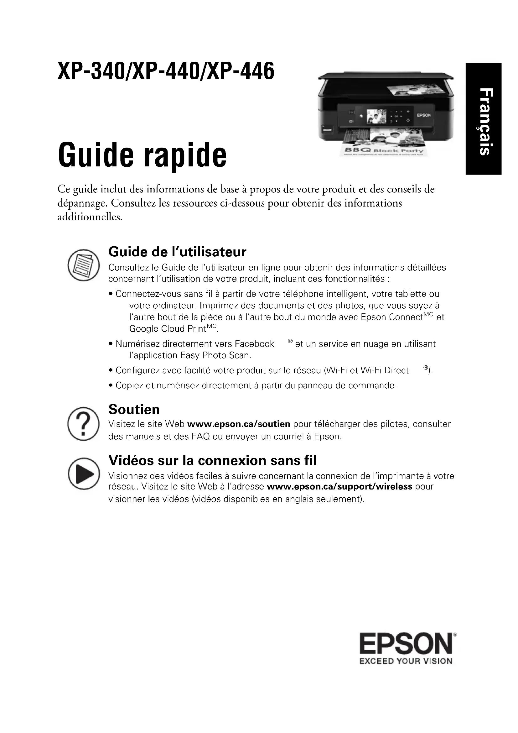 General Notice: Other product names used herein are for identification purposes only and may be trademarks of their respective owners. Epson disclaims any and all rights in those marks. This information is subject to change without notice. © 2016 Epson America, Inc., 10/16XP-340/XP-440/XP-446 Guide rapide Ce guide inclut des informations de base à propos de votre produit et des conseils de dépannage. Consultez les ressources ci-dessous pour obtenir des informations additionnelles. Guide de l’utilisateur Consultez le Guide de l’utilisateur en ligne pour obtenir des informations détaillées concernant l’utilisation de votre produit, incluant ces fonctionnalités :