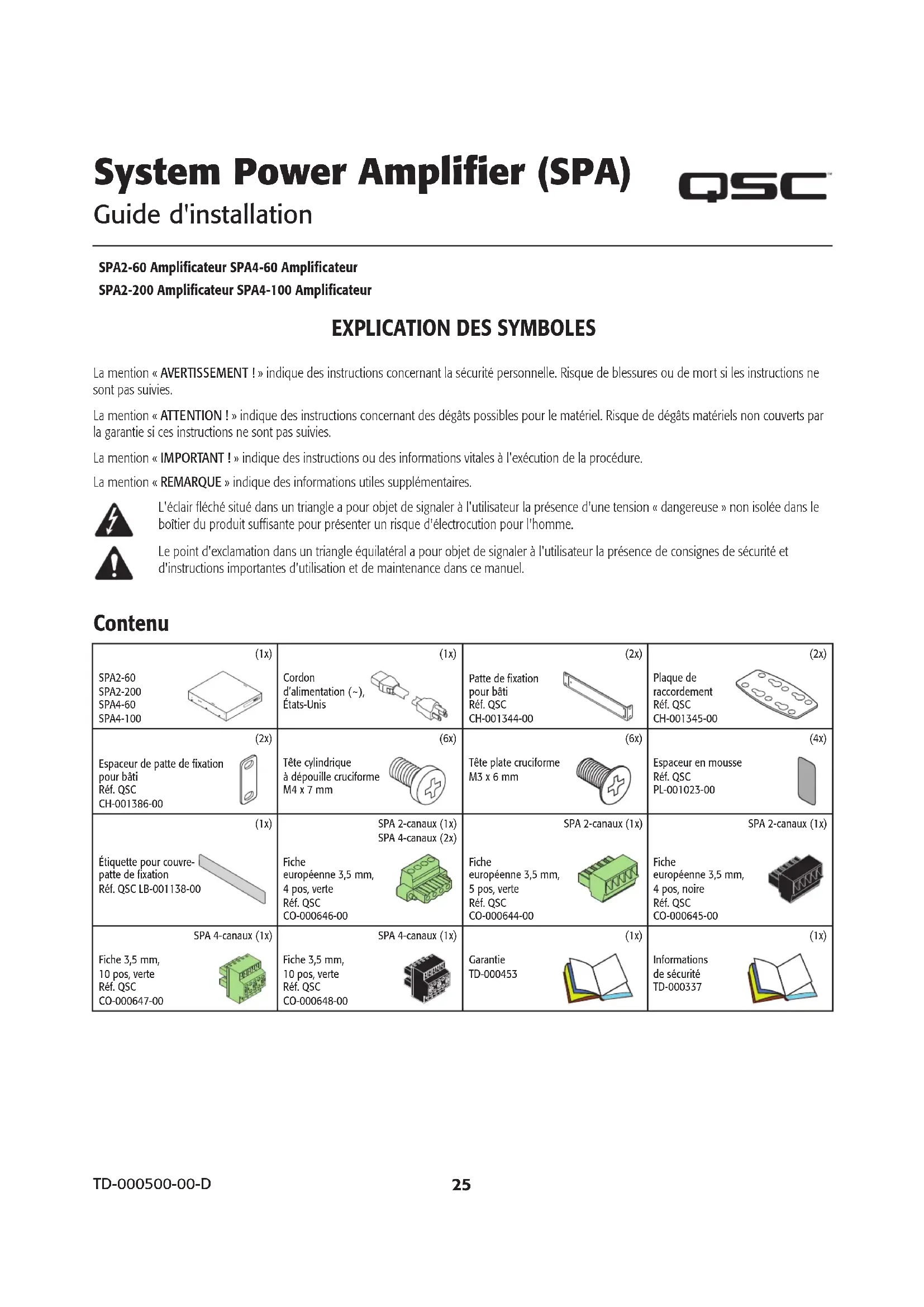 La mention « AVERTISSEMENT ! » indique des instructions concernant la sécurité personnelle. Risque de blessures ou de mort si les instructions ne sont pas suivies. La mention « ATTENTION ! » indique des instructions concernant des dégâts possibles pour le matériel. Risque de dégâts matériels non couverts par la garantie si ces instructions ne sont pas suivies. La mention « IMPORTANT ! » indique des instructions ou des informations vitales à l'exécution de la procédure. La mention « REMARQUE » indique des informations utiles supplémentaires. L'éclair fléché situé dans un triangle a pour objet de signaler à l'utilisateur la présence d'une tension « dangereuse » non isolée dans le boîtier du produit suffisante pour présenter un risque d'électrocution pour l'homme. Le point d'exclamation dans un triangle équilatéral a pour objet de signaler à l'utilisateur la présence de consignes de sécurité et d'instructions importantes d'utilisation et de maintenance dans ce manuel. Contenu (1x) SPA2-60 SPA2-200 SPA4-60 SPA4-100 (1x) Cordon d’alimentation (~), États-Unis (2x) Pattedexationpour bâti Réf. QSC CH-001344-00 (2x) Plaque de raccordement Réf. QSC CH-001345-00 (2x) Espaceurdepattedexationpour bâti Réf. QSC CH-001386-00 (6x) Tête cylindrique à dépouille cruciforme M4 x 7 mm (6x) Tête plate cruciforme M3 x 6 mm (4x) Espaceur en mousse Réf. QSC PL-001023-00 (1x) Étiquette pour couvre-pattedexation Réf. QSC LB-001138-00SPA 2-canaux (1x) SPA 4-canaux (2x)Fiche européenne 3,5 mm, 4 pos, verte Réf. QSC CO-000646-00 SPA 2-canaux (1x) Fiche européenne 3,5 mm, 5 pos, verte Réf. QSC CO-000644-00 SPA 2-canaux (1x) Fiche européenne 3,5 mm, 4 pos, noire Réf. QSC CO-000645-00 SPA 4-canaux (1x)Fiche 3,5 mm, 10 pos, verte Réf. QSC CO-000647-00 SPA 4-canaux (1x)Fiche 3,5 mm, 10 pos, verte Réf. QSC CO-000648-00 (1x) Garantie TD-000453 (1x) Informations de sécurité TD-000337 TD-000500-00-D26 TD-000500-00-D