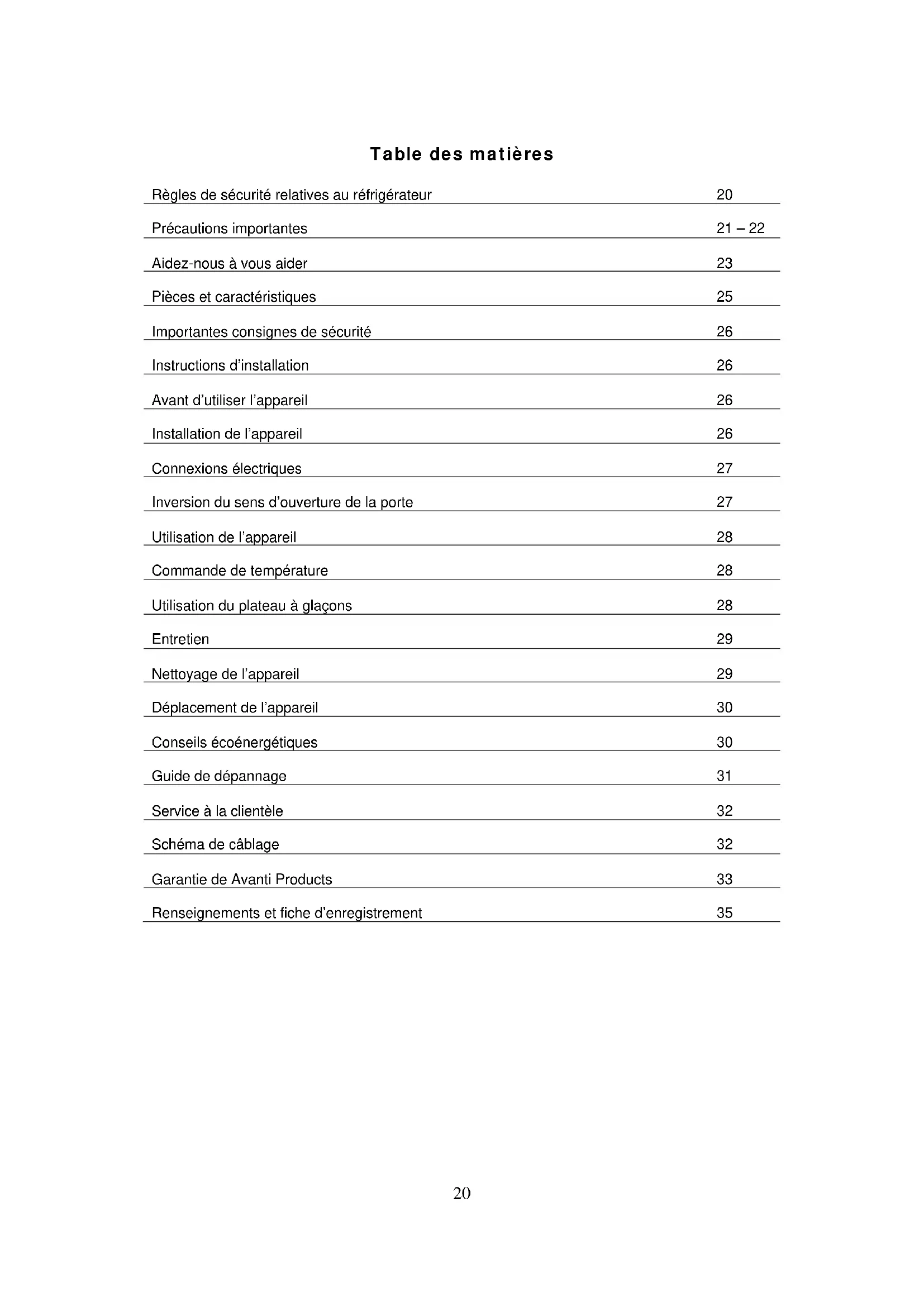 Nous sommes fiers de notre service à la clientèle et de notre réseau de techniciens professionnels qui assurent l’entretien de votre réfrigérateur-congélateur Avanti. Avec l’achat de votre réfrigérateur-congélateur Avanti, vous êtes assuré d’obtenir des renseignements ou de l’assistance additionnels en cas de besoin; l’équipe du service à la clientèle de Avanti Products est là pour vous aider. N’hésitez pas à communiquer avec nous, sans frais. SERVICE À LA CLIENTÈLE DE AVANTI PRODUCTS Renseignements sur les produits 800 323-5029 Quelles que soient vos questions concernant nos produits, nous pouvons vous aider. Commande de pièces 800 220-5570 Vous pouvez commander des pièces et des accessoires qui seront livrés directement chez vous, et payer par chèque personnel, par mandat, ou par carte de crédit MasterCard ou Visa. Service de réparation à domicile 800 220-5570 Un centre de service Avanti Products autorisé vous fournira un service de réparation professionnel, prévu à un moment qui vous convient. Nos techniciens qualifiés connaissent votre réfrigérateur-congélateur de fond en comble.