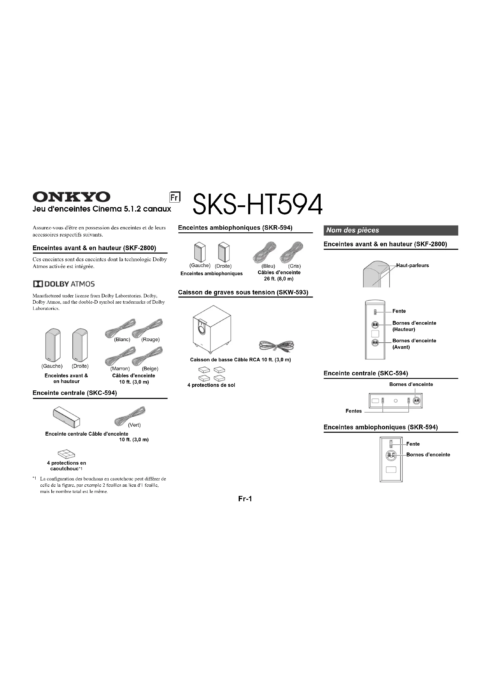 Jeu d'enceintes Cinema 5.1.2 canaux Assurez-vous d'être en possession des enceintes et de leurs accessoires respectifs suivants. Enceintes avant & en hauteur (SKF-2800) Ces enceintes sont des enceintes dont la technologie Dolby Atmos activée est intégrée.Manufactured under license from Dolby Laboratories. Dolby, Dolby Atmos, and the double-D symbol are trademarks of Dolby Laboratories. Enceinte centrale (SKC-594)