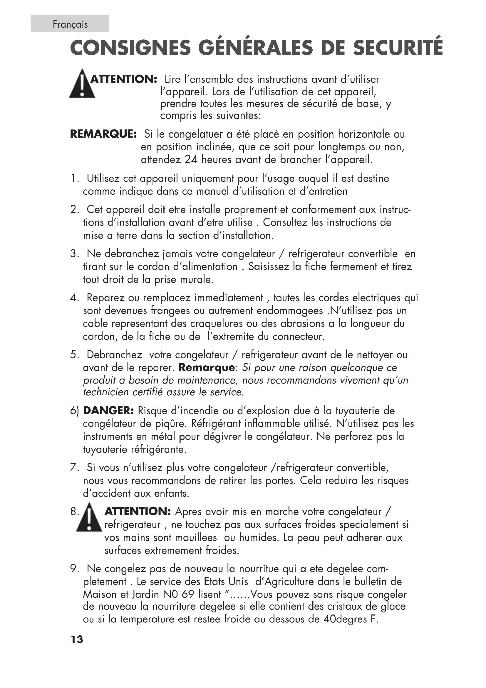 INSTRUCTIONS ATTENTION - Risque d’incendie ou d’explosion Ayez la propriété selon des règlements fédéraux ou locaux. Réfrigérant inflammable utilisé. DANGER Risque d’occlusion d’enfant. Avant que vous jetiez votre vieux réfrigérateur ou congélateur, enlevez les portes. Laissez les étagères en place de sorte que les enfants ne puissent pas facilement s’élever à l’intérieur. Français