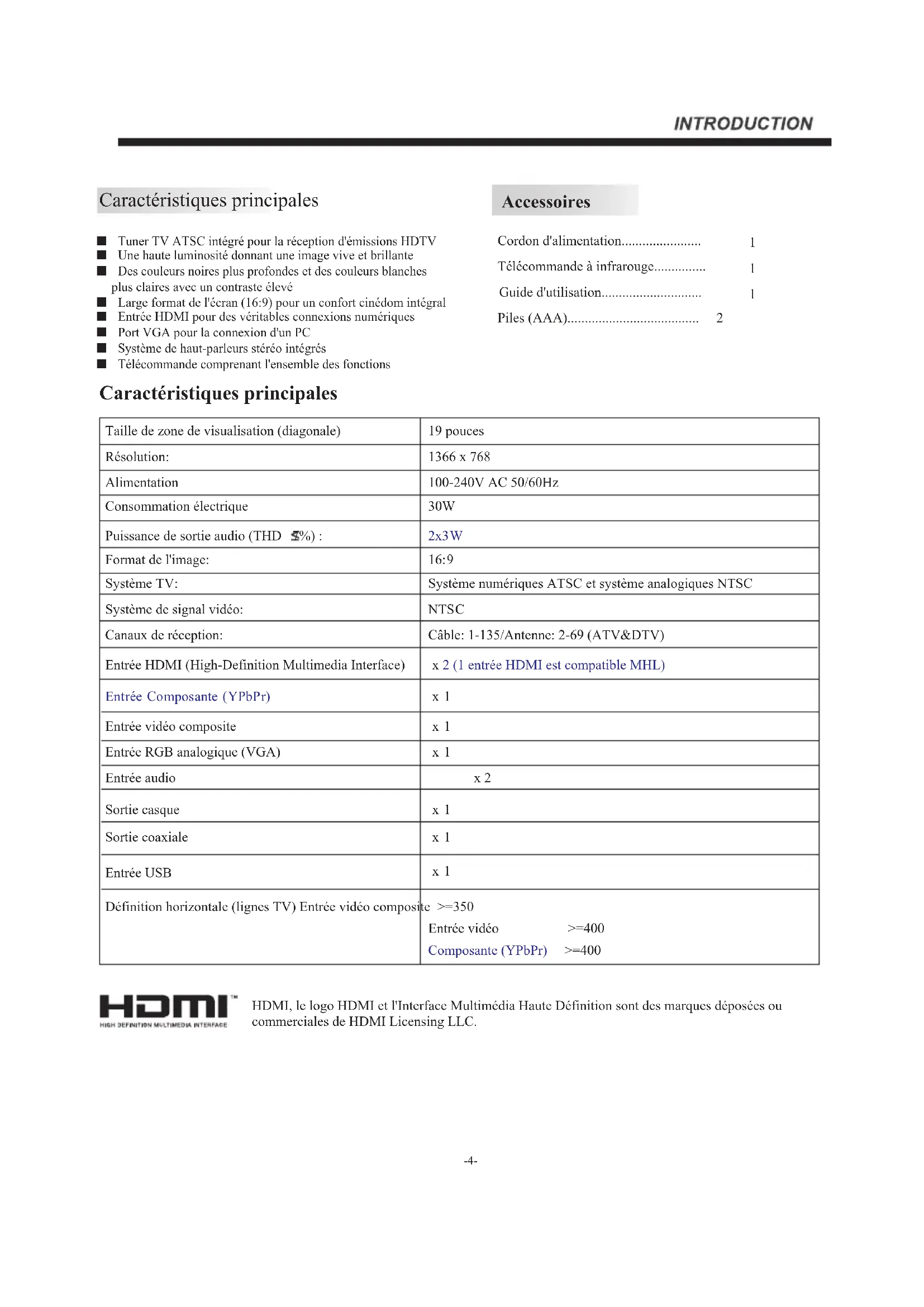 ■ Tuner TV ATSC intégré pour la réception d'émissions HDTV ■ Une haute luminosité donnant une image vive et brillante ■ Des couleurs noires plus profondes et des couleurs blanches plus claires avec un contraste élevé ■ Large format de l'écran (16:9) pour un confort cinédom intégral ■ Entrée HDMI pour des véritables connexions numériques ■ Port VGA pour la connexion d'un PC ■ Système de haut-parleurs stéréo intégrés ■ Télécommande comprenant l'ensemble des fonctions HDMI, le logo HDMI et l'Interface Multimédia Haute Définition sont des marques déposées ou commerciales de HDMI Licensing LLC. Caractéristiques principales x 2 (1 entrée HDMI est compatible MHL) Résolution: Système TV: Système de signal vidéo: Canaux de réception: 16:9 NTSC Câble: 1-135/Antenne: 2-69 (ATV&DTV) x 1 Entrée HDMI (High-Definition Multimedia Interface) Entrée audio x 2 x 1 Définition horizontale (lignes TV) Entrée vidéo composite >=350 Composante (YPbPr) >=400 Entrée vidéo >=400 x 1 100-240V AC 50/60Hz 2x3W Système numériques ATSC et système analogiques NTSC Sortie casque x 1 x 1 Sortie coaxiale Format de l'image: Taille de zone de visualisation (diagonale) Alimentation Puissance de sortie audio (THD 7%) : Entrée Composante (YPbPr) Entrée vidéo composite Entrée RGB analogique (VGA) Consommation électrique x 1 Entrée USB 1366 x 768 19 pouces 30W-5- Base Stand Assembly Instruction