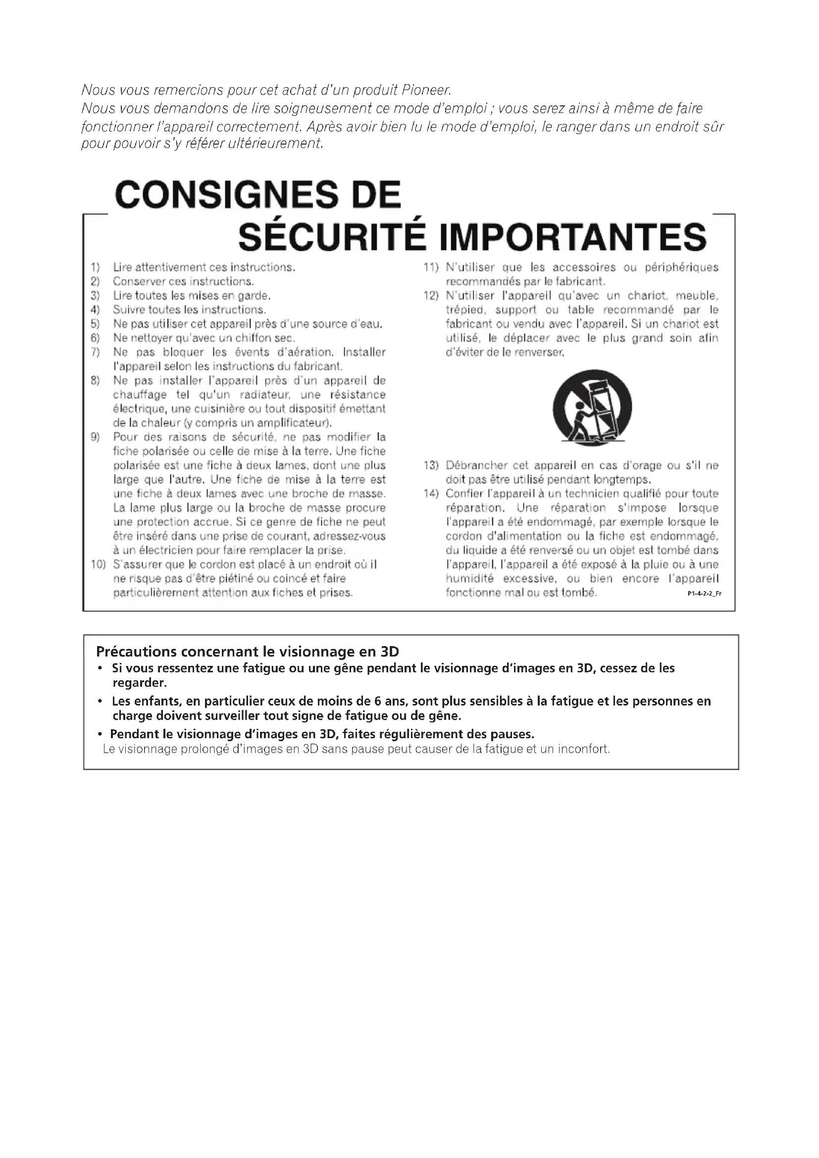 - Pendant le visionnage d’images en 3D, faites régulièrement des pauses. Le visionnage prolongé d’images en 3D sans pause peut causer de la fatigue et un inconfort. P1-4-2-2_Fr Nous vous remercions pour cet achat d’un produit Pioneer. Nous vous demandons de lire soigneusement ce mode d’emploi ; vous serez ainsi à même de faire fonctionner l’appareil correctement. Après avoir bien lu le mode d’emploi, le ranger dans un endroit sûr pour pouvoir s’y référer ultérieurement. BDP-62FD_UCXE_FR.book Page 2 Monday, June 25, 2012 3:14 PMATTENTION Cet appareil est un produit laser de Classe 1, classé selon l’article IEC 60825-1:2007 relatif à la Sécurité des produits laser.