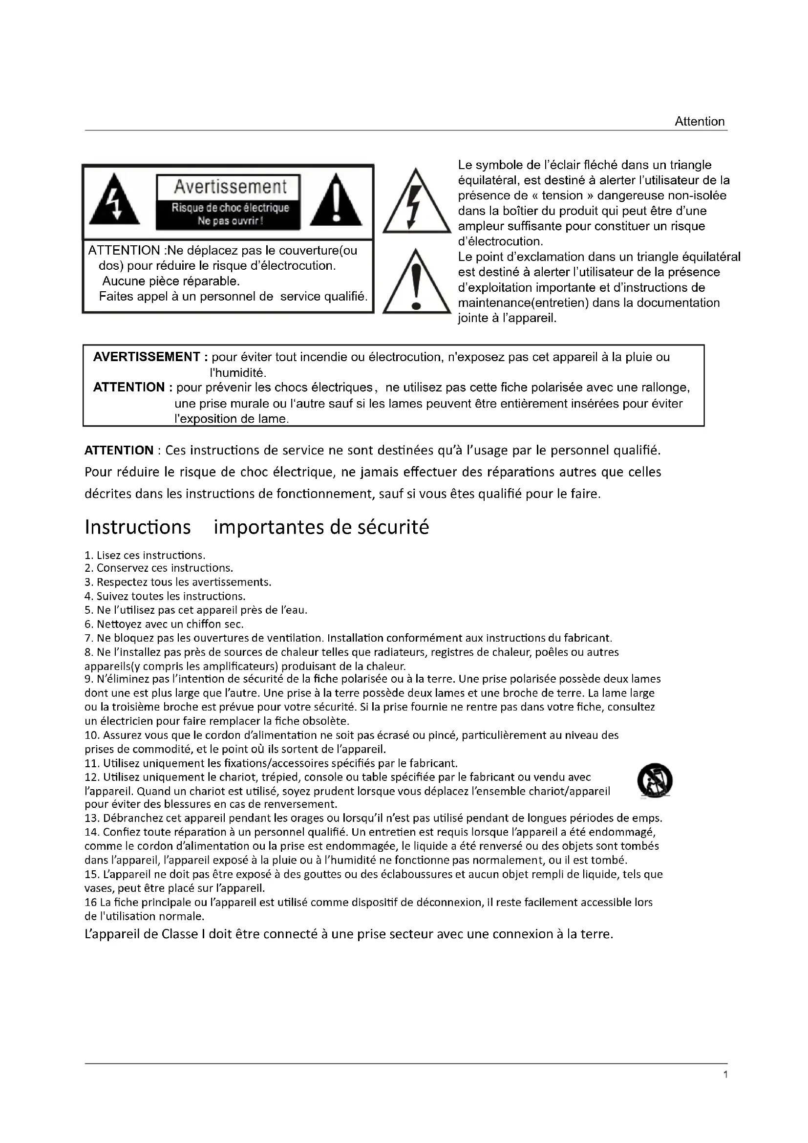 l'humidité. ATTENTION : pour prévenir les chocs électriques,ne utilisez pas cette fiche polarisée avec une rallonge, une prise murale ou l‘autre sauf si les lames peuvent être entièrement insérées pour éviter l'exposition de lame. ATTENTION : Ces instƌƵĐƟŽŶƐ de service ne ƐŽnt desƟnées qu’à l’usage par le persŽŶŶĞů ƋƵĂůŝĮé. PŽur réduire le risque de cŚŽc électrique, ne jamais eīectuer des réparaƟŽns autres que celles décrites dans les instƌƵĐƟŽŶƐ de fŽŶĐƟŽŶŶĞŵĞnt, sauf si vŽus êtes ƋƵĂůŝĮé ƉŽƵƌ le faire. InsƚƌƵĐƟŽŶƐ ŝŵƉŽƌtantes de sécurité