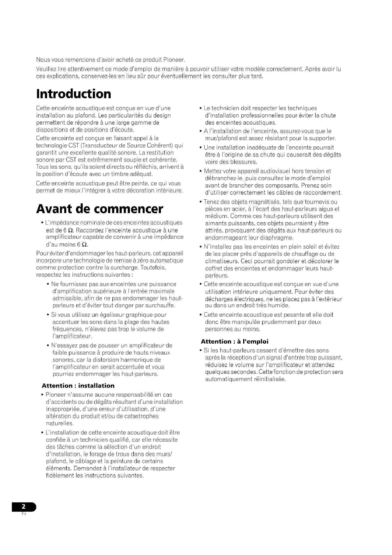 Nous vous remercions d’avoir acheté ce produit Pioneer. Veuillez lire attentivement ce mode d’emploi de manière à pouvoir utiliser votre modèle correctement. Après avoir lu ces explications, conservez-les en lieu sûr pour éventuellement les consulter plus tard. Introduction Cette enceinte acoustique est conçue en vue d’une installation au plafond. Les particularités du design permettent de répondre à une large gamme de dispositions et de positions d’écoute. Cette enceinte est conçue en faisant appel à la technologie CST (Transducteur de Source Cohérent) qui garantit une excellente qualité sonore. La restitution sonore par CST est extrêmement souple et cohérente. Tous les sons, qu’ils soient directs ou réfléchis, arrivent à la position d’écoute avec un timbre adéquat. Cette enceinte acoustique peut être peinte, ce qui vous permet de mieux l’intégrer à votre décoration intérieure. Avant de commencer