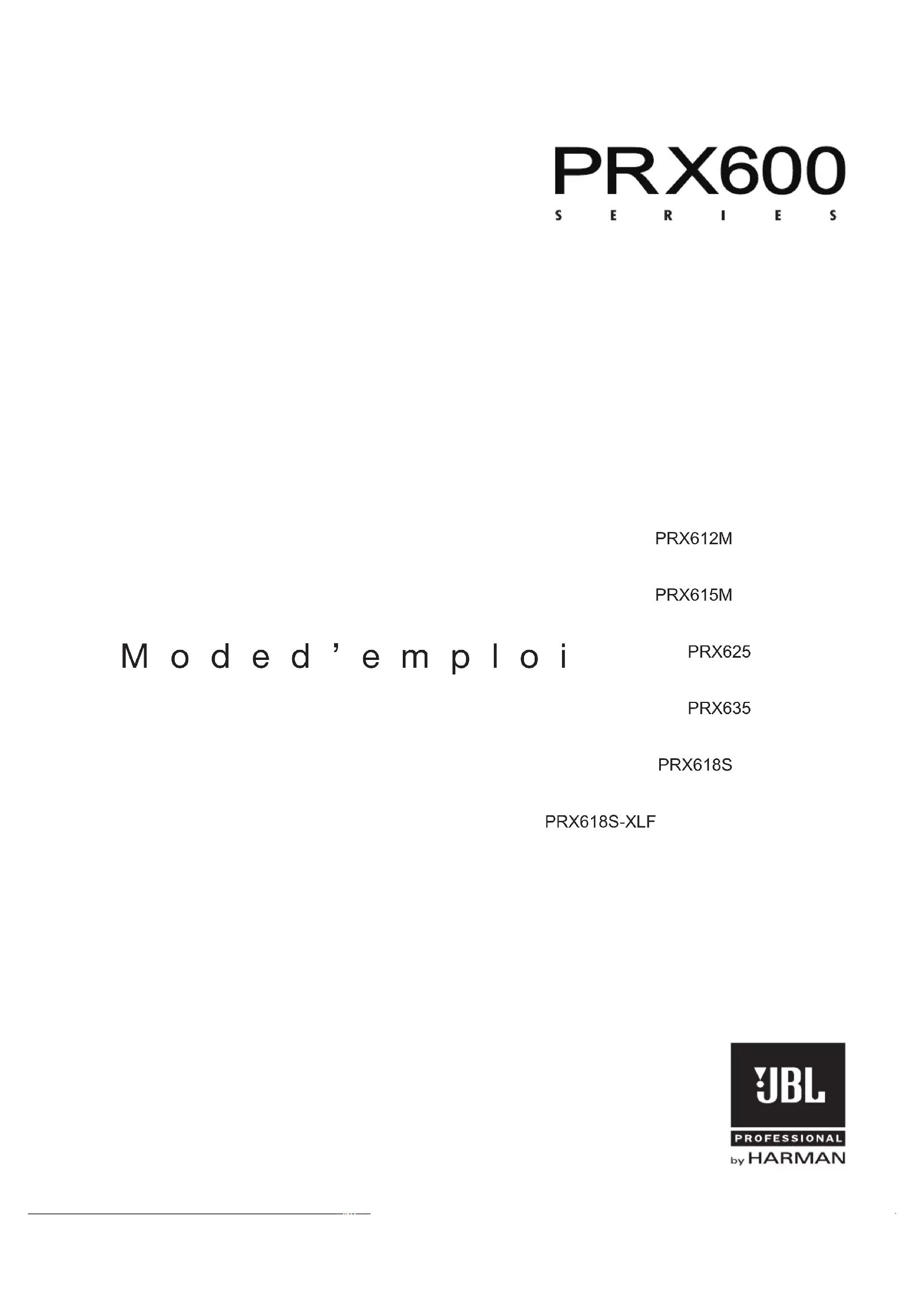 P R X 6 1 2 M P R X 6 1 5 M P R X 6 2 5 P R X 6 3 5 P R X 6 1 8 S P R X 6 1 8 S - X L F M o d e d ’ e m p l o i PRX600.UsersGuide.Fr.qxd:Layo 1 24/10/11 19:40 Page 12 PRX600.UsersGuide.Fr.qxd:Layo 1 24/10/11 19:40 Page 23 Instructions de sécurité importantes 4 Précautions 5 Suspension du système d’enceintes 6 - 7 Faites attention à ces symboles 8 Déclaration de conformité des enceintes de la gamme PRX600 9 L’amplificateur de puissance de la gamme PRX600 10 Introduction à la gamme PRX600 11 - 12 Caractéristiques du système 13 - 18 Installation du système 19 - 22 Réglage de la sensibilité d’entrée 23 Réglage du gain 24 Exemples d’applications 25 - 28 Référence 29 Câbles et connecteurs 30 Guide de dépannage 31 - 32 Coordonnées de contact JBL 33 SOMMAIRE PRX600.UsersGuide.Fr.qxd:Layo 1 24/10/11 19:40 Page 34