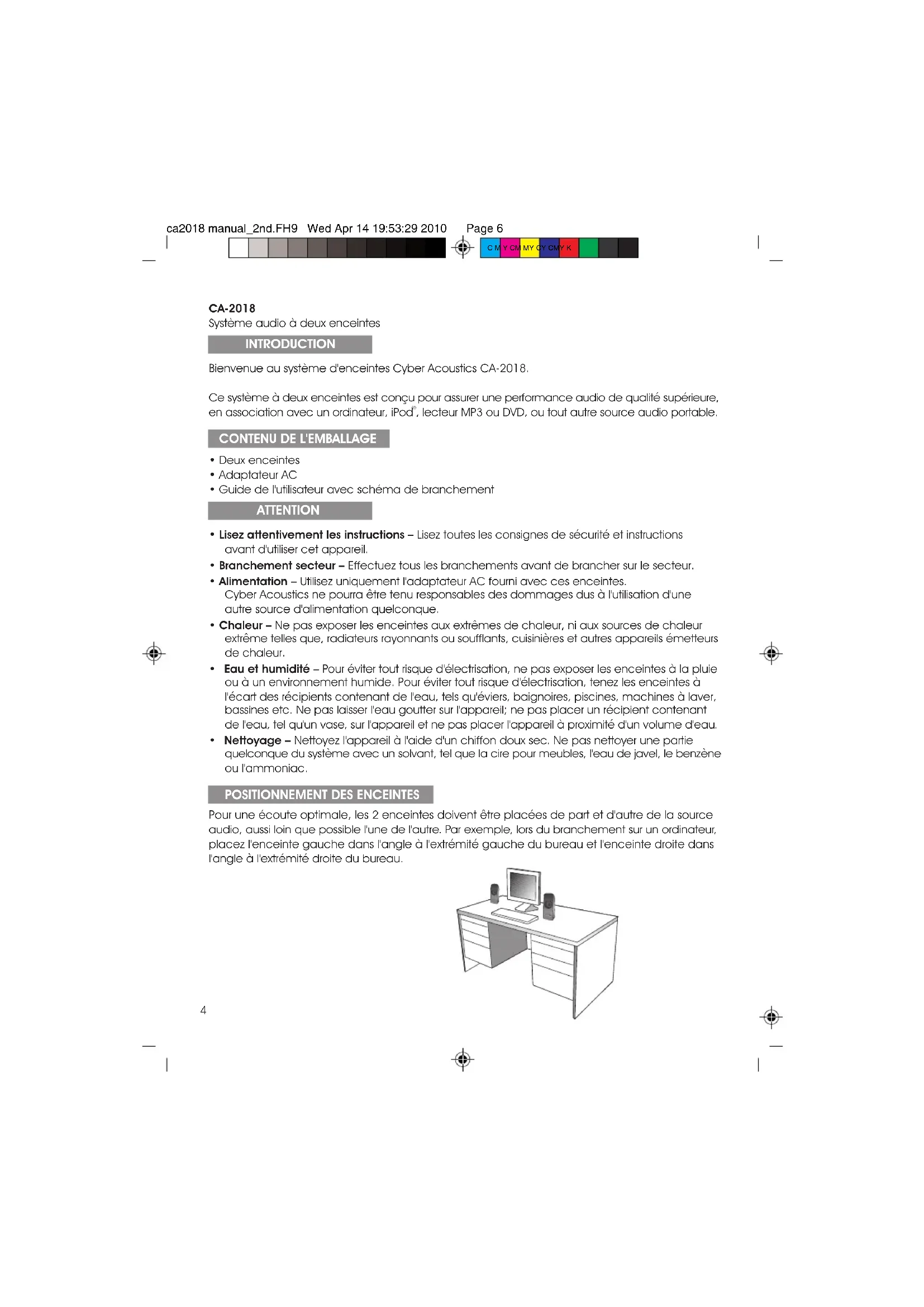 Lisez attentivement les instructions Lisez toutes les consignes de sécurité et instructions avant d'utiliser cet appareil. Branchement secteur Effectuez tous les branchements avant de brancher sur le secteur. Alimentation Utilisez uniquement l'adaptateur AC fourni avec ces enceintes. Cyber Acoustics ne pourra être tenu responsables des dommages dus à l'utilisation d'une autre source d'alimentation quelconque. Chaleur Ne pas exposer les enceintes aux extrêmes de chaleur, ni aux sources de chaleur extrême telles que, radiateurs rayonnants ou soufflants, cuisinières et autres appareils émetteurs de chaleur. Eau et humidité Pour éviter tout risque d'électrisation, ne pas exposer les enceintes à la pluie ou à un environnement humide. Pour éviter tout risque d'électrisation, tenez les enceintes à l'écart des récipients contenant de l'eau, tels qu'éviers, baignoires, piscines, machines à laver, bassines etc. Ne pas laisser l'eau goutter sur l'appareil; ne pas placer un récipient contenant de l'eau, tel qu'un vase, sur l'appareil et ne pas placer l'appareil à proximité d'un volume d'eau. Nettoyage Nettoyez l'appareil à l'aide d'un chiffon doux sec. Ne pas nettoyer une partie quelconque du système avec un solvant, tel que la cire pour meubles, l'eau de javel, le benzène ou l'ammoniac. Deux enceintes Adaptateur AC Guide de l'utilisateur avec schéma de branchementca2018 manual_2nd.FH9 Wed Apr 14 19:53:29 2010 Page 7 C M Y CM MY CY CMY K Marche/arrêt Le bouton marche/arrêt est situé sur l'enceinte satellite droite. Appuyez pour allumer. Appuyez de nouveau pour éteindre le système. Commande principale du volume La commande est située sur l'enceinte satellite droite, identifiée par le marquage volume. Tournez la commande dans le sens des aiguilles d'une montre pour augmenter le volume, et dans le sens inverse pour le diminuer. Prise sortie casque Lorsque vous branchez votre casque sur cette prise, le son des enceintes est coupé automatiquement. Commandez alors le volume du casque avec la commande principale.