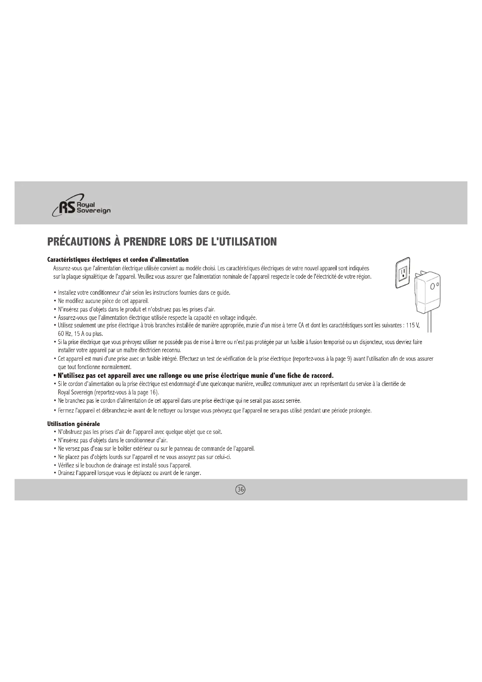 - Si le cordon d'alimentation ou la prise électrique est endommagé d'une quelconque manière, veuillez communiquer avec un représentant du service à la clientèle de Royal Sovereign (reportez-vous à la page 16).