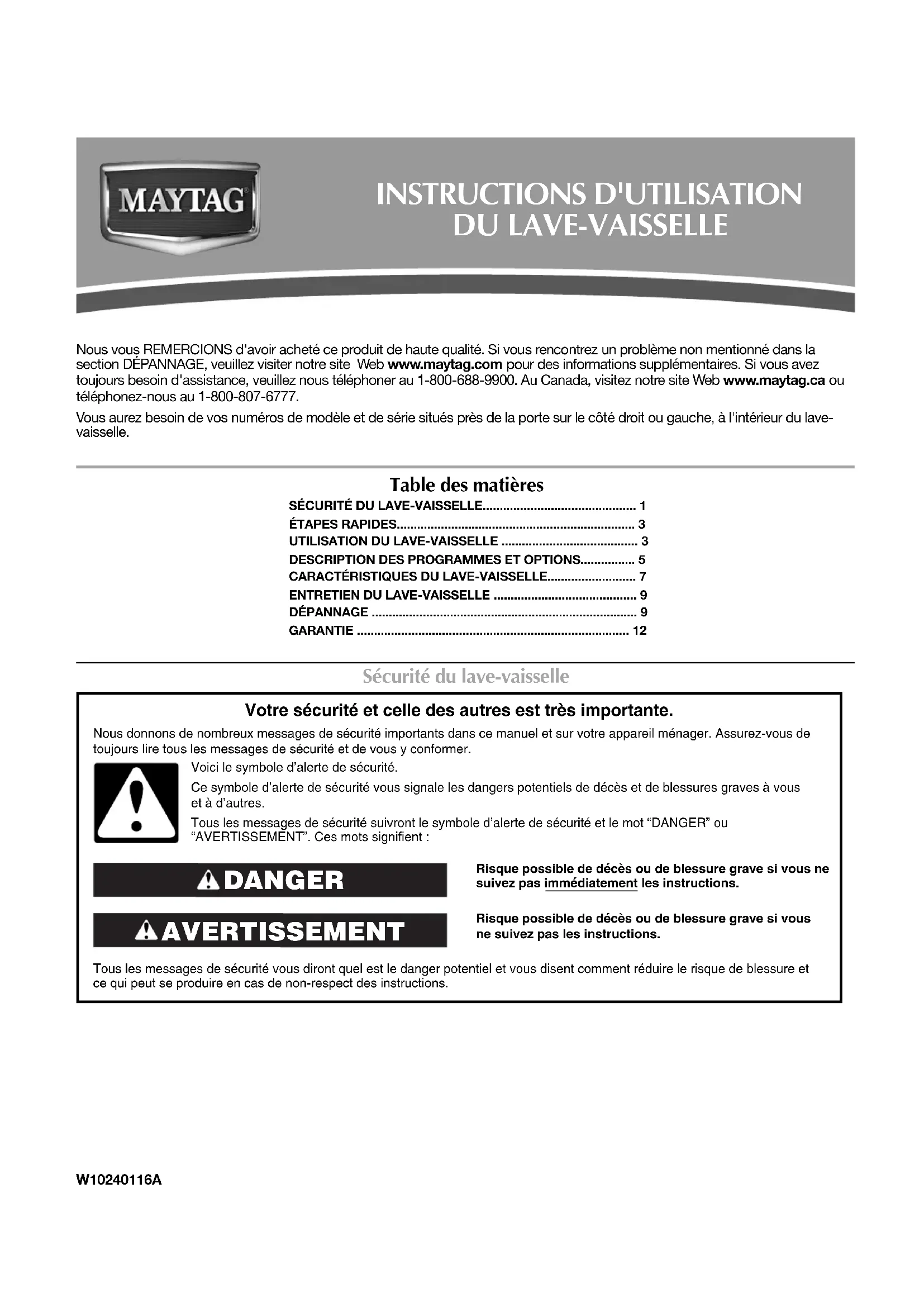 9. Les frais de transport pour le service d'un produit si votre gros appareil est situé dans une région éloignée où un service d’entretien Maytag autorisé n’est pas disponible. 10. La dépose et la réinstallation de votre gros appareil si celui-ci est installé dans un endroit inaccessible ou n'est pas installé conformément aux instructions d'installation fournies. 11. Les gros appareils ménagers dont les numéros de série et de modèle originaux ont été enlevés, modifiés ou qui ne peuvent pas être facilement identifiés. La présente garantie est nulle si le numéro de série d’usine a été modifié ou enlevé du gros appareil ménager. Le coût d’une réparation ou d'un remplacement dans le cadre de ces circonstances exclues est à la charge du client. CLAUSE D'EXONÉRATION DE RESPONSABILITÉ AU TITRE DES GARANTIES IMPLICITES; LIMITATION DES RECOURS LE SEUL ET EXCLUSIF RECOURS DU CLIENT DANS LE CADRE DE LA PRÉSENTE GARANTIE LIMITÉE CONSISTE EN LA RÉPARATION PRÉVUE CI-DESSUS. LES GARANTIES IMPLICITES, Y COMPRIS LES GARANTIES APPLICABLES DE QUALITÉ MARCHANDE ET D'APTITUDE À UN USAGE PARTICULIER, SONT LIMITÉES À UN AN OU À LA PLUS COURTE PÉRIODE AUTORISÉE PAR LA LOI. MAYTAG N'ASSUME AUCUNE RESPONSABILITÉ POUR LES DOMMAGES FORTUITS OU INDIRECTS. CERTAINES JURIDICTIONS NE PERMETTENT PAS L'EXCLUSION OU LA LIMITATION DES DOMMAGES FORTUITS OU INDIRECTS, OU LES LIMITATIONS DE LA DURÉE DES GARANTIES IMPLICITES DE QUALITÉ MARCHANDE OU D'APTITUDE À UN USAGE PARTICULIER, DE SORTE QUE CES EXCLUSIONS OU LIMITATIONS PEUVENT NE PAS S'APPLIQUER DANS VOTRE CAS. CETTE GARANTIE VOUS CONFÈRE DES DROITS JURIDIQUES SPÉCIFIQUES ET VOUS POUVEZ ÉGALEMENT JOUIR D'AUTRES DROITS QUI PEUVENT VARIER D'UNE JURIDICTION À UNE AUTRE. Si vous résidez à l'extérieur du Canada et des 50 États des États-Unis, contactez votre marchand Maytag autorisé pour déterminer si une autre garantie s'applique. 2/09 Pour des informations supplémentaires sur le produit, aux É.-U., visiter www.maytag.com. Au Canada, visiter www.maytag.ca. Si vous n’avez pas accès à Internet et que vous nécessitez une assistance pendant l’utilisation du produit ou que vous souhaitez prendre un rendez-vous, vous pouvez contacter Maytag au numéro ci-dessous. Préparez votre numéro de modèle au complet. Vous trouvez les numéros de modèle et de série sur la plaque signalétique située près de la porte à droite ou à gauche de l'intérieur du lave-vaisselle. Pour assistance ou service aux É.-U., composez le 1-800-688-9900. Au Canada, composez le 1-800-807-6777. Si vous avez besoin de plus d’assistance, vous pouvez écrire à Maytag en soumettant toute question ou problème à l’adresse suivante : Aux États-Unis : Maytag Brand Home Appliances Customer eXperience Center 553 Benson Road Benton Harbor, MI 49022-2692 Au Canada : Maytag Brand Home Appliances Centre pour d’eXpérience à la clientèle 1901 Minnesota Court Mississauga, Ontario L5N 3A7 Dans votre correspondance, veuillez indiquer un numéro de téléphone où l’on peut vous joindre dans la journée. Veuillez conserver le manuel de l’utilisateur et le numéro de modèle pour référence ultérieure. W10240116A SP PN W10240117A © 2009. Tous droits réservés. ®Marque déposée/™Marque de commerce de Maytag Corporation ou de ses compagnies affiliées. Emploi sous licence Maytag Limited au Canada. 6/09 Imprimé aux É.-U.
