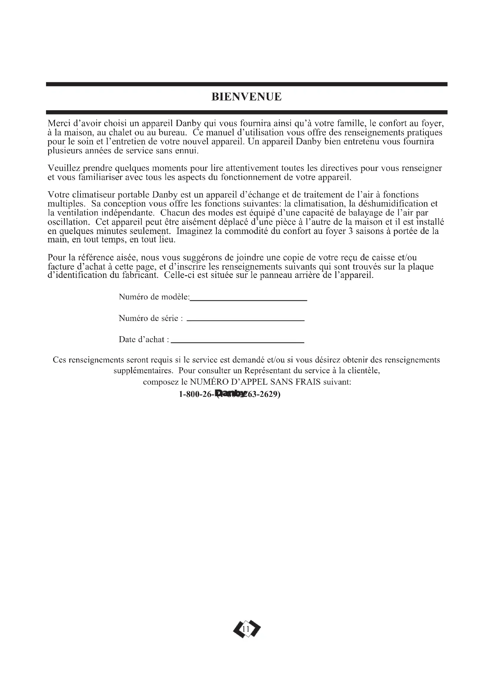 - Remove drain plug on rear bottom and drain out water. Occasionally, a problem may occur that is minor, and a service call may not be necessary. Use this troubleshooting guide for a possible solution. If the unit continues to operate improperly, call an authorized service depot for assistance, or Danby’s Toll Free Number: 1-800-26-Merci d’avoir choisi un appareil Danby qui vous fournira ainsi qu’à votre famille, le confort au foyer, à la maison, au chalet ou au bureau. Ce manuel d’utilisation vous offre des renseignements pratiques pour le soin et l’entretien de votre nouvel appareil. Un appareil Danby bien entretenu vous fournira plusieurs années de service sans ennui. Veuillez prendre quelques moments pour lire attentivement toutes les directives pour vous renseigner et vous familiariser avec tous les aspects du fonctionnement de votre appareil. Votre climatiseur portable Danby est un appareil d’échange et de traitement de l’air à fonctions multiples. Sa conception vous offre les fonctions suivantes: la climatisation, la déshumidification et la ventilation indépendante. Chacun des modes est équipé d’une capacité de balayage de l’air par oscillation. Cet appareil peut être aisément déplacé d’une pièce à l’autre de la maison et il est installé en quelques minutes seulement. Imaginez la commodité du confort au foyer 3 saisons à portée de la main, en tout temps, en tout lieu. Pour la référence aisée, nous vous suggérons de joindre une copie de votre reçu de caisse et/ou facture d’achat à cette page, et d’inscrire les renseignements suivants qui sont trouvés sur la plaque d’identification du fabricant. Celle-ci est située sur le panneau arrière de l’appareil. Numéro de modèle: Numéro de série : Date d’achat : Ces renseignements seront requis si le service est demandé et/ou si vous désirez obtenir des renseignements supplémentaires. Pour consulter un Représentant du service à la clientèle, composez le NUMÉRO D’APPEL SANS FRAIS suivant: 1-800-26- (1-800-263-2629) BIENVENUE 11TABLEAU 2 Types de fusibles et de réceptacles Tension nominale 125 Ampères 15 Prise de courant Intensité de fusible 15 Fusible temporisé Type fiche (ou disjoncteur de circuit) LISEZ TOUTE L'INFORMATION DE SÉCURITÉ AVANT UTILISATION