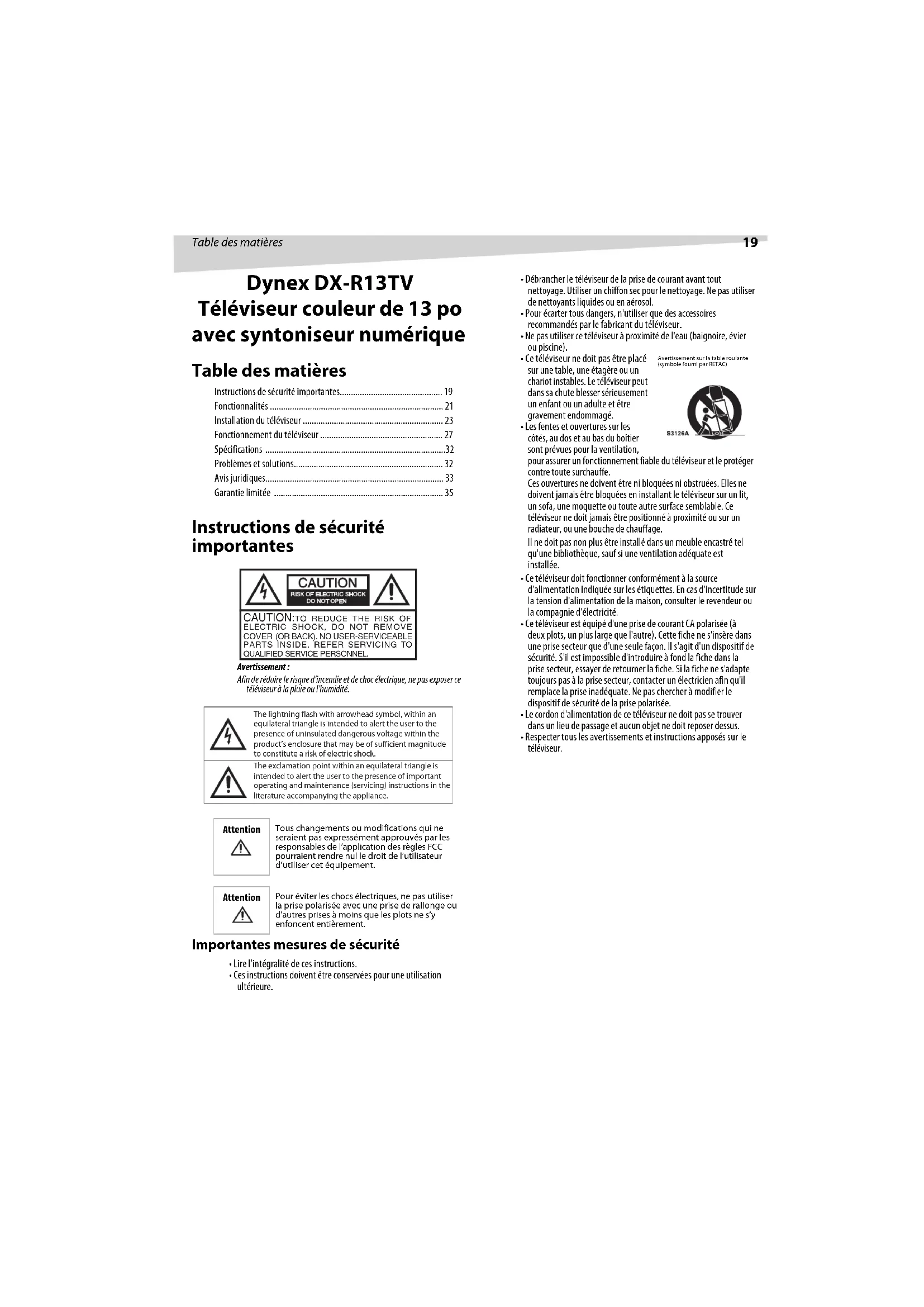 - Dynex DX-R13TV Téléviseur couleur de 13 po avec syntoniseur numérique Table des matières Instructions de sécurité importantes p. 19